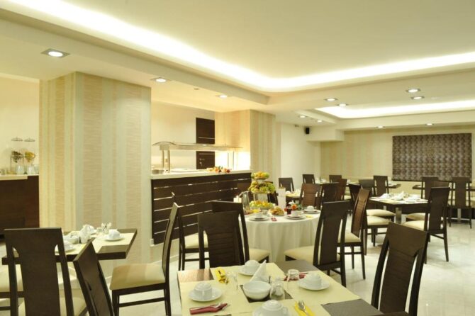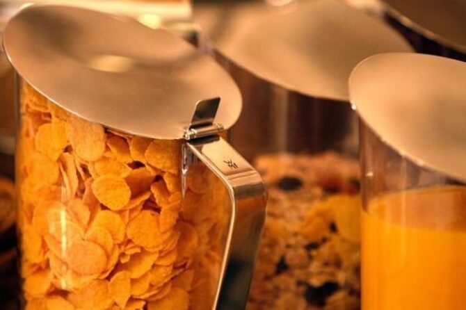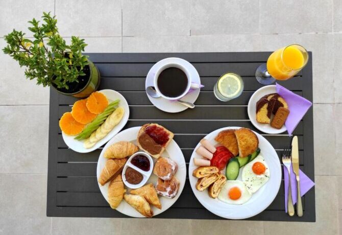 На завтрак в кафетерии отеля предложат стандартный набор – жирненький холодный круассан, сладкий апельсиновый нектар и капуччино, сваренный по эксклюзивному греческому рецепту.