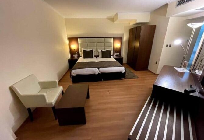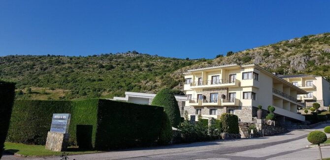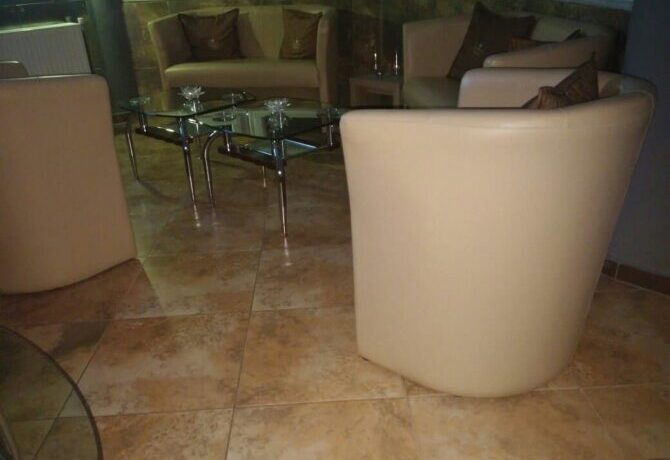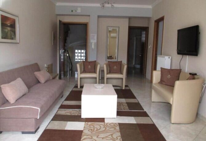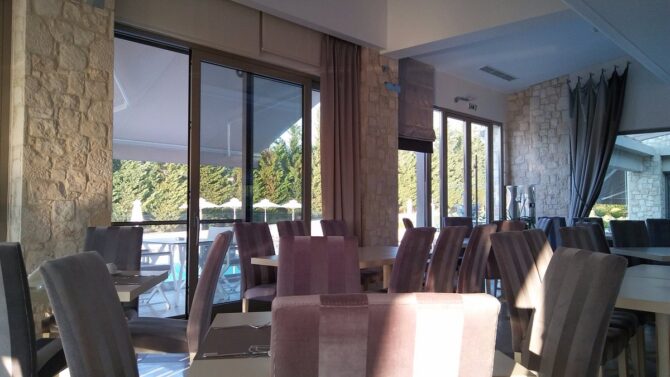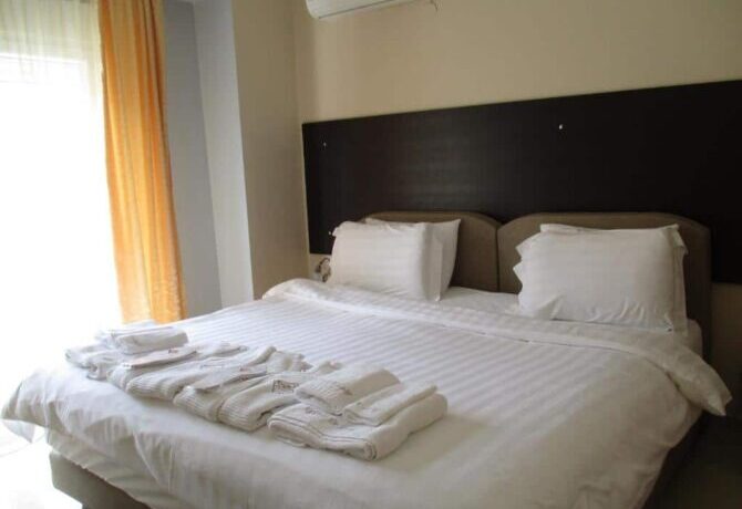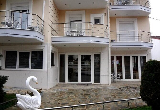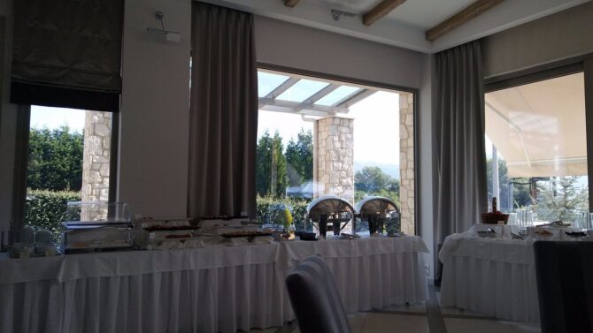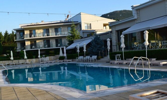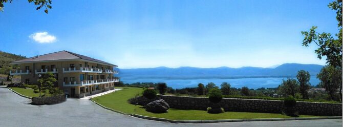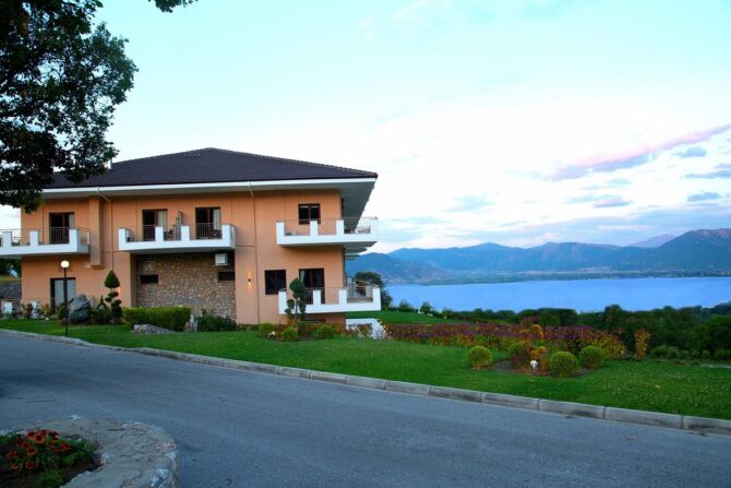 Enastron View – это отель достойного уровня с завораживающими видами одновременно на озеро и на горы, с удобными большими номерами и общей террасой, на которой приятно завтракать. Расположен в деревне Лутраки на 700 метрах над уровнем моря, вокруг чистый рафинированный газон и художественно подстриженные немножко калечные греческие кустарники. В номерах ничего лишнего, неприятного или смущающего – чистота, тишина и хороший кондиционер. Идеальное место для изумительного ночного отдыха с легким перекусом на завтрак – и все, больше в этом отеле делать нечего. Вперед, в меховой выставочный центр! До него всего 2 километра.