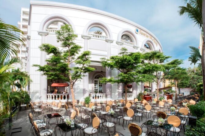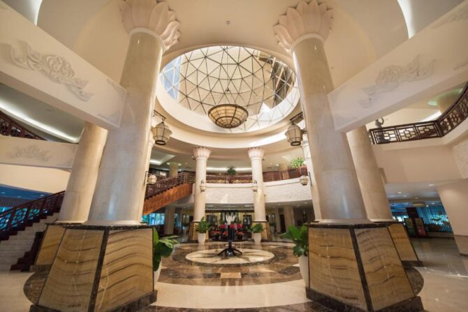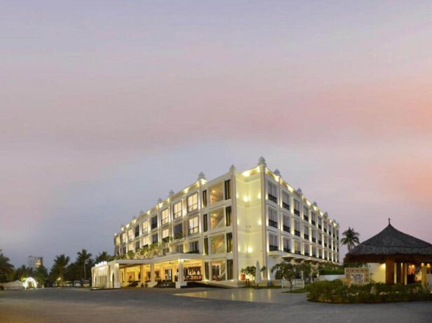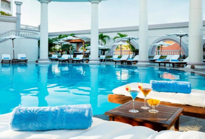 В центре Нячанга на первой береговой линии возвышается белоснежный, красиво декорированный, корпус пятизвездочного отеля Sunrise Nha Trang Beach Hotel & Spa. Это элитный курортный комплекс в колониальном стиле с изысканными интерьерами. Посреди внутреннего двора расположен бассейн, построенный в древнеримском стиле, фасад ресторана внешне напоминает стену Колизея. На территории обустроено несколько зон отдыха, на частном пляже установлены шезлонги под зонтиками. Шеф-повар ресторана практикует высокую азиатскую кухню. В ней много овощей, морепродуктов и всевозможных соусов к рису. Оценить искусство местных кулинаров можно во время завтрака, который накрывается для всех гостей и входит в оплату проживания. Этот отель любят деловые люди. Здесь для них предусмотрены условия для ведения бизнеса, переговоров, отдыха после насыщенного дня. Все номера, без исключения, соответствуют статусу обеспеченных людей. В простых, но со вкусом оформленных комнатах, установлена мебель из натурального дерева, предусмотрены зона отдыха на лоджиях и место для приема гостей.