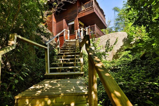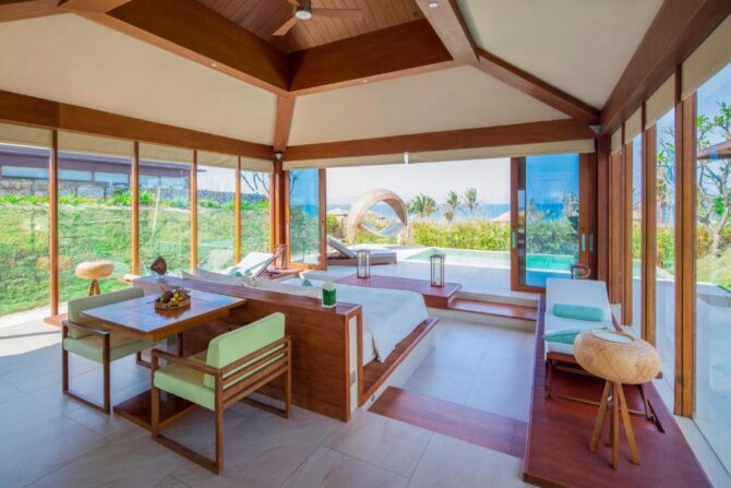 Вилла Six Senses Ninh Van Bay предлагает пятизвездочный сервис вдали от города прямо на берегу моря. До пляжа идти всего минуту. Но главное, что оценили гости, это особая атмосфера, созданная благодаря использованию при строительстве только натуральных материалов. Дома и вся обстановка выполнены из дерева, крыши покрыта соломой, а каменная чаша бассейна вырезана в прибрежном валуне. Использован традиционный вьетнамский интерьер с постелью на подиуме, циновками на окнах, столиком для чайной церемонии и национальными элементами декора. Ванная комната обустроена на открытой террасе. Она находится на верхнем этаже, откуда открывается панорамный вид на живописную бухту, морские просторы, горы и лес. Ресторан накрывает столы там, где предпочтут поужинать гости. Официанты обслужат в лаундже возле бассейна, на пляже, верхней террасе с видом на закат. У отеля есть своя пристань, откуда можно отправиться на морскую прогулку. Рядом с ней по вечерам владельцы оборудуют ночной кинозал под открытым небом. Этой вилле еще есть, чем удивить искушенных туристов. Например, винный погреб бара расположен в одной из ближних пещер. Туда можно спуститься на дегустацию вин, которую проводит профессиональный сомелье.