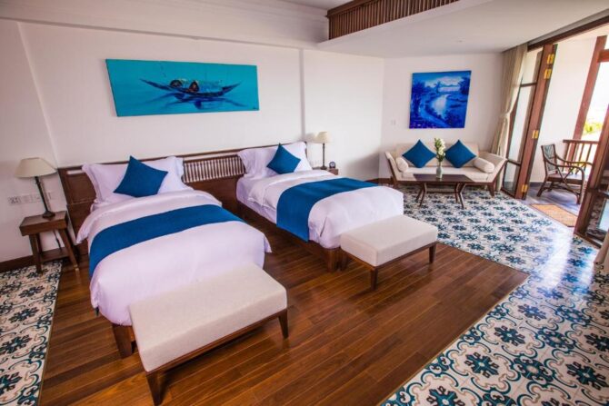 Пятизвездочный отель The Anam находится на окраине города Камрань в зеленой зоне. В двух шагах от этого элитного комплекса расположен частный пляж. Морское побережье покрыто белоснежным песком, на котором установлены шезлонги, зонтики, разложены полотенца. В изыскано оформленных номерах есть балконы и ванные комнаты с современной сантехникой. Гостям предоставляется бесплатный трансфер от/до центра города. Это место ценят творческие натуры, особенно художники. Местность утопает в зелени пышного сада, а пейзажи так и просятся на холст. Владельцы обожают живопись. Они часто покупают картины у местных художников и размещают их в отеле. Для постояльцев гарантированы круглосуточное обслуживание номеров, питание в 3-х ресторанах на выбор, веселое времяпрепровождение в пляжном клубе, купание в 3-х открытых бассейнах, услуги современного СПА-салона.
