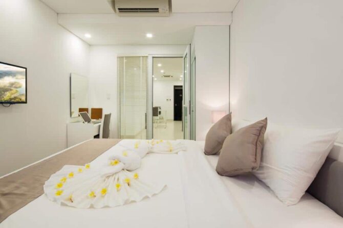 Fusion Resort Cam Ranh — All Spa Inclusive 5* предлагает полный пакет включенных в стоимость проживания СПА-услуг. Вьетнам славится особым подходом к оздоровлению организма, поэтому процедуры проводятся только с применением лекарственных растений, качественных эфирных масел, растительной косметики. В штате отеля работают инструкторы по йоге, тайцзи-цюань и медитации. Если есть желание поправить здоровье и снять напряжение после нескольких месяцев напряженной работы, то нужно воспользоваться предложениями этого комплекса. Услужливый персонал доставит еду и напитки в номер, подготовит постель ко сну, поможет с покупкой билетов и предоставит еще массу полезных услуг.