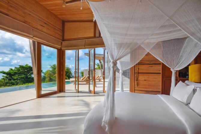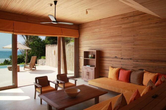 Курорт Six Senses Con Dao расположен на самом большом острове архипелага Кон Сон. Он состоит из 47 вилл с отдельными инфинити-бассейнами и собственной зоной отдыха. Дома построены из дерева. Продуманная система природной вентиляции позволила практически отказаться от применения кондиционеров. Владельцы являются сторонниками бережного отношения к окружающей среде, участвуют в международной программе «Жилье для осознанных путешествий». Комплекс возведен на склонах прибрежных дюн, откуда открываются удивительные виды на морские просторы.
