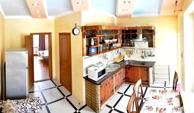 - Первый жилой комплекс. Здесь расположены двухкомнатные апартаменты с 3 кроватями, два двухкомнатных полулюкса и два однокомнатных номера с видом на горы.