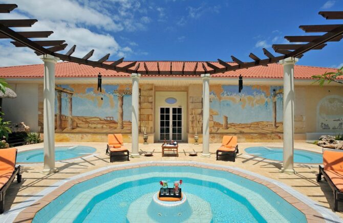 Планировка отеля необычна. Вестибюль, лобби-бар и главный бассейн образуют центральную секцию, а на восточной и западной стороне есть блоки номеров, каждый блок оснащен бассейном.