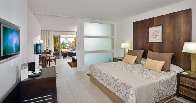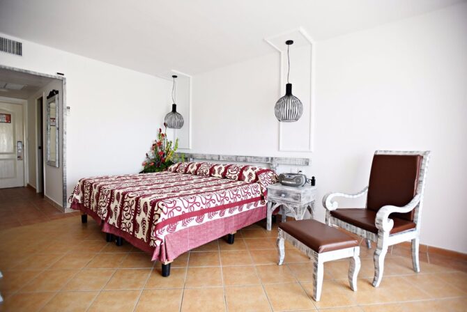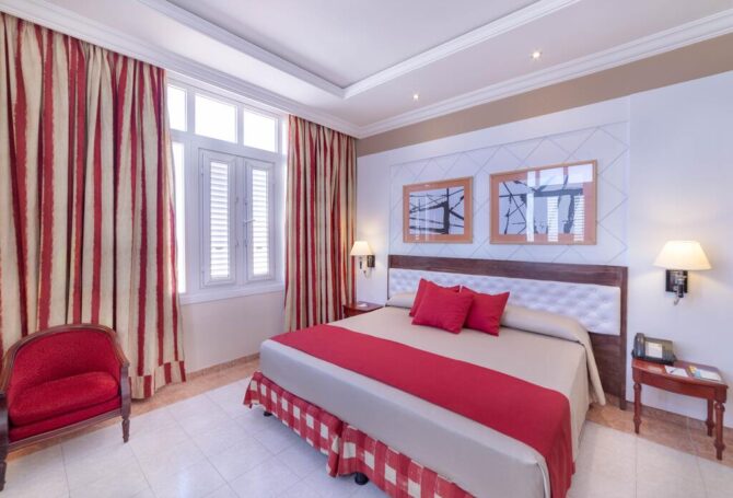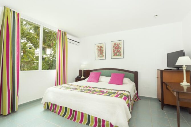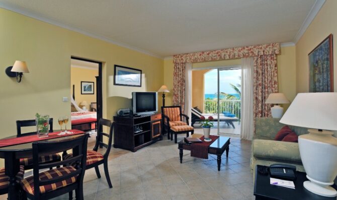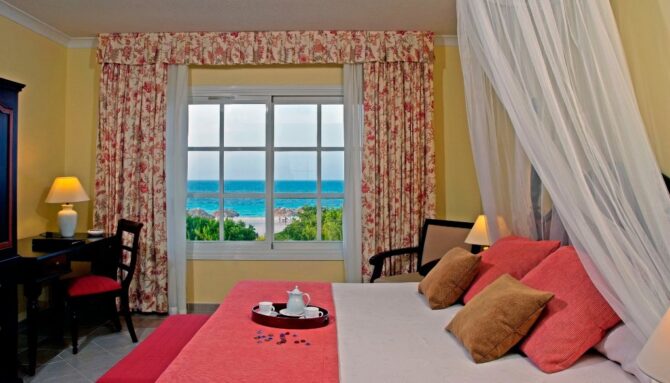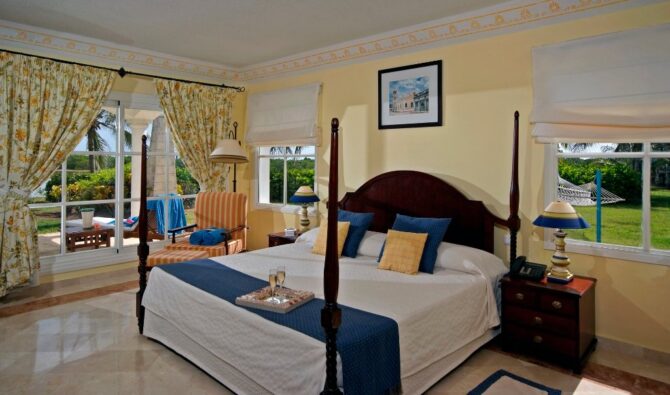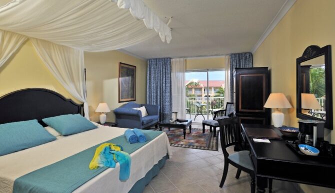 Номера оформлены в нейтральных тонах, мебель из темного дерева, песочные стены, бордовые покрывала и пурпурные полозья кровати создают классический кубинский интерьер. Небольшие диваны с откидной спинкой обеспечивают обилие мест для отдыха, а столы с поворотными ножками — рабочие поверхности. Стены украшены произведениями искусства. Во всех номерах есть балконы или террасы с уличной мебелью. Из окон открывается вид либо на бассейн, либо на пляж. В ванных комнатах, облицованных коричневой мраморной плиткой, есть все удобства, фен, увеличительное зеркало и большой набор индивидуальных косметических принадлежностей.