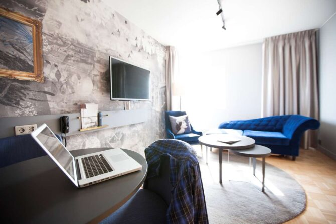 Элегантные номера оформлены в темных тонах, аутентичные детали северной культуры рисуют неповторимый образ страны тысячи озер. Максимальный комфорт ждет гостей в номере-люкс «Lapland Suite» с собственной сауной.