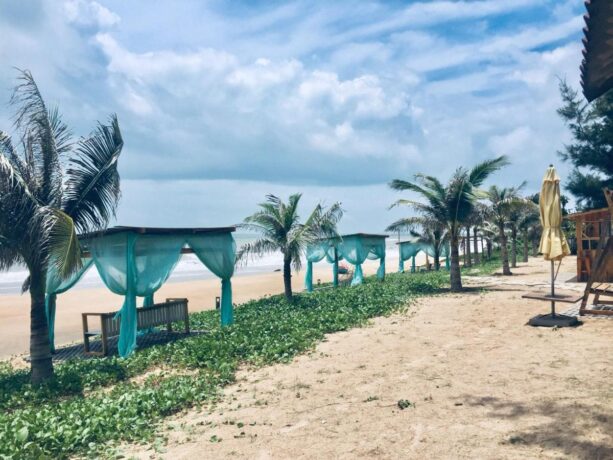 - пляж, примыкающий к территории отеля; на песчаной полосе установлены высокие тенты и плетеные скамейки.