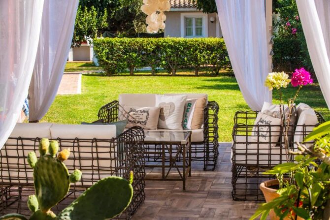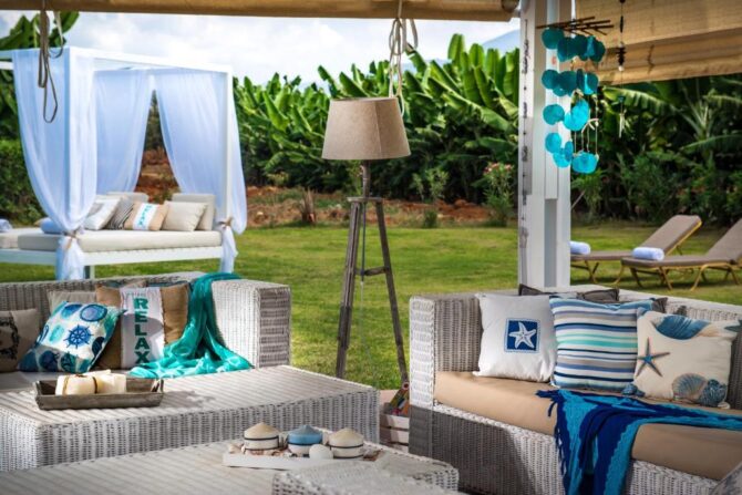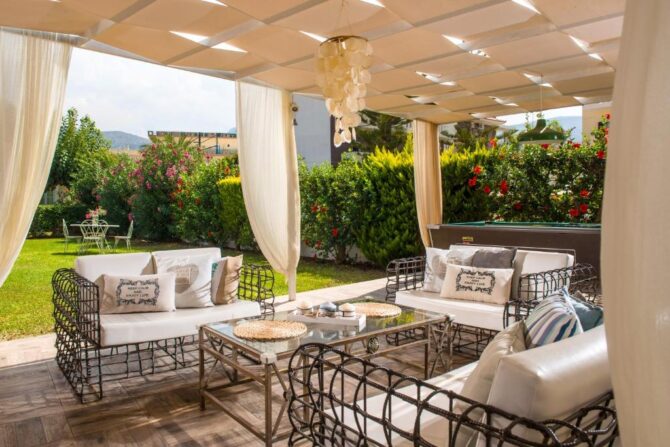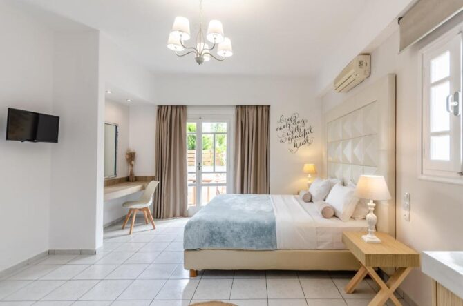 Четырехзвездочный гостиничный комплекс состоит из 6 корпусов. Для проживания гостей подготовлено 102 уютных номера. Даже те, кто может себе позволить заплатить за сервис чуть больше остальных, стараются забронировать для отпуска именно этот отель. Все дело в созданной здесь атмосфере. Все номера оформлены в индивидуальном стиле, все гипоаллергенные. Работают рестораны «Estia», «Seaside», а также три бара. Для отдыха предусмотрены бассейн, спа-центр, вечерние развлекательные программы. Трансфер не предоставляется, но есть бесплатная парковка. Пляж песчаный с установленными зонтиками и шезлонгами.
