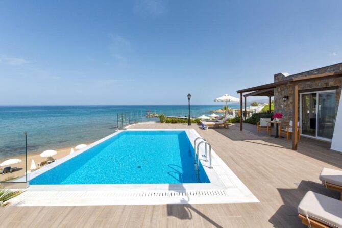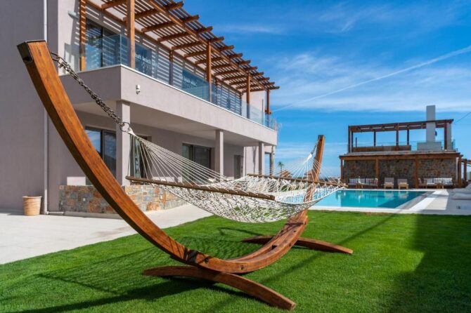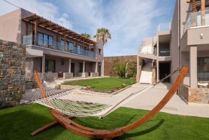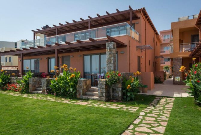 Для тех, кто не ищет местной аутентичности, а хочет окружить себя современностью, подойдет пяти звездочный отель «Royal Heights Resort». Он удален от пляжа на 1 км, зато расположен в красивой холмистой местности. В фонде – 30 номеров, роскошно оформленных, укомплектованных современной мебелью, с оборудованной кухней. По уровню комфортности они относятся к Делюксам, Сюитам и виллам. Общая площадь составляет 240 тысяч кв. м. У каждой виллы имеется своя площадка для отдыха и загара, веранда, собственный бассейн, в саду установлена мебель. Для занятий в свободное время предусмотрен фитнес-зал, большой спа-комплекс, детская игровая площадка. В основном ресторане, где накрывается общий завтрак, готовят блюда критской кухни. В кафе-баре подаются легкие закуски, вино, десерты. На территории имеется бесплатная парковка, автомобиль на прокат можно взять в аэропорту Ираклиона. Расстояние между ним и отелем составляет 20 км.