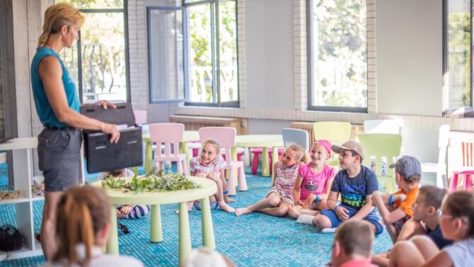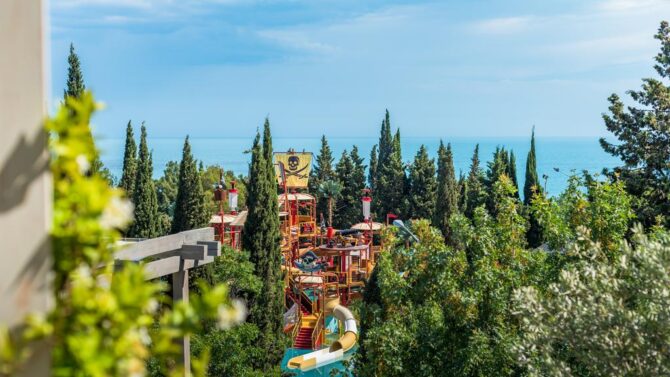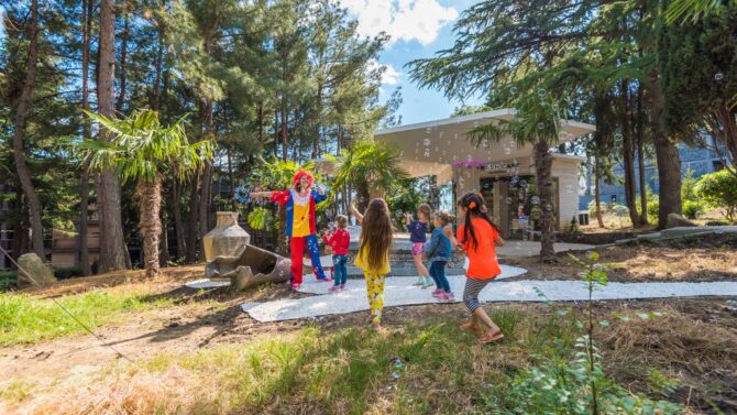 Дети до 5 лет проживают бесплатно (без спального места и питания), до 13 лет со скидками. Для их досуга работают подогреваемые бассейны с водными аттракционами — аквапарк, детская комната с воспитателем, клуб, городок с качелями, зоопарк, команда аниматоров.