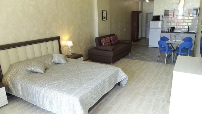 8 номеров имеют статус Семейных. Они расположены со 2 по 5 этаж, окна выходят на море, общая площадь составляет 35,7 кв. м. Семейные апартаменты – это 2-уровневая квартира, занимающая 1 и 2 этажи. В наличии только один номер данной категории. Во всех апартаментах и студиях имеется кухня. Для гостей, поселившихся в других номерах, работает кафе, а также оборудована общая кухня.