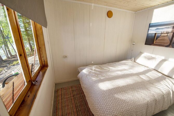 Коттедж в лесу на берегу озера изначально предназначался для загородного отдыха на природе. Сюда приезжают, чтобы порыбачить или провести уик-энд. Для гостей оборудовано место для барбекю. У причала есть весельная лодка. Хозяева обеспечили посетителей настольными играми и дартсом. Прямо перед домом оборудован частный пляж.
