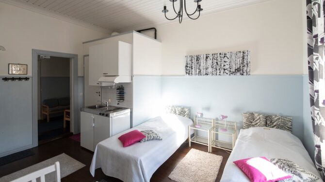Одноэтажный гостевой дом находится в шаговой доступности от центра Миккели и в 7 км от горнолыжного курорта. Комнаты небольшие, но достаточно уютные. Интерьер разработан с учетом зонирования на спальные места и возможности работать с компьютером. К услугам постояльцев общая кухня и бесплатная парковка. Хозяин говорит по-английски. Он же поможет разобраться с барбекю, а для каждых новых гостей обязательно приготовит комплимент в виде фруктов или вкусных десертов. До подъемника Торнимяки – 5 км.