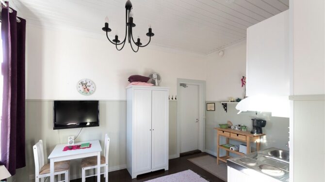 Удобные и недорогие апартаменты находятся в Миккели. Одноэтажный домик с мансардой находится прямо на перекрестке дорог. Мимо проехать не получится. Дом сдается целиком. В нем всего 1 спальня, есть кухня, столовая, во дворе – уютный дворик. С животными нельзя. Владельцы не берут денег за парковку. Рядом работают несколько ресторанов и кафе, есть супермаркет. До ближайшего подъемника Торнимяки – 7 км.