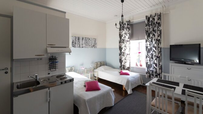 В 10 минутах ходьбы от центра Миккели находится старый район города. В комплексе, состоящем из зданий 1882 года постройки, расположены апартаменты Huoneistohotelli Marja. Дома только внешне напоминают старинную архитектуру. Они полностью отреставрированы и оборудованы современной техникой. Завтрак накрывается в большой столовой. Можно заказать континентальный или вегетарианский вариант. Чтобы покататься на горных лыжах, нужно проехать 5 км до ближайшего подъемника.