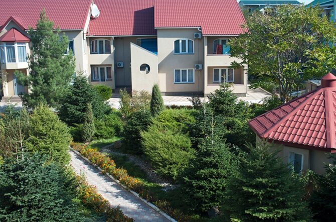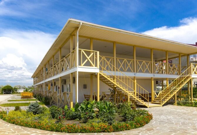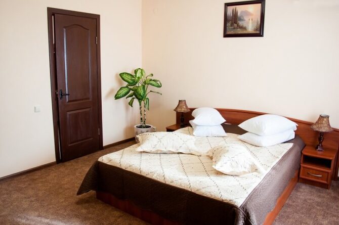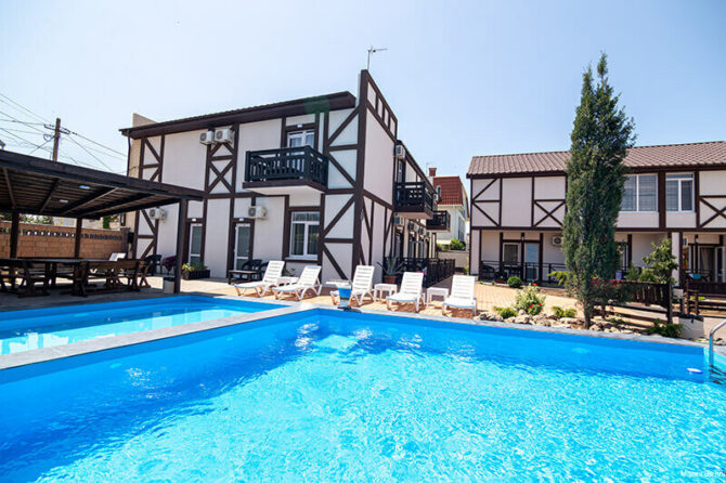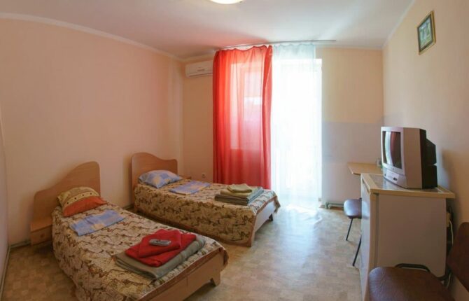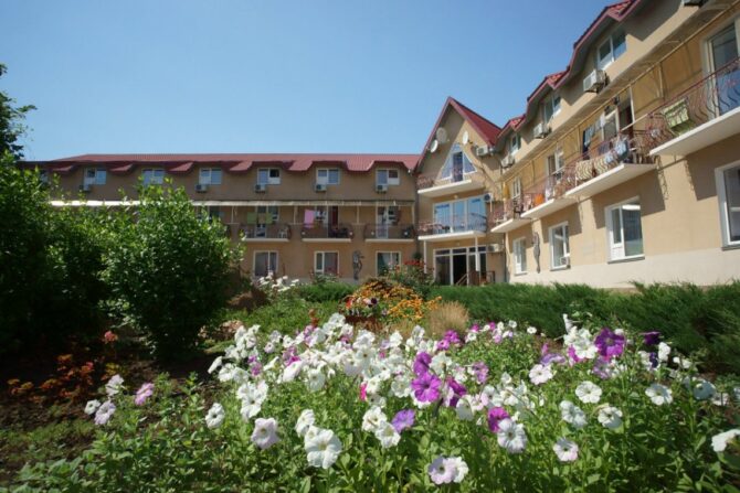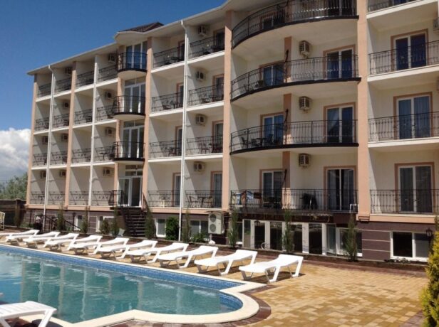 Номерной фонд отеля расположен в двух 4-этажных корпусах. В первом корпусе находятся комнаты эконом-класса. В каждой имеется балкон, санузел, только площадь не превышает 16 кв. м. Второй корпус называется «Комфорт». Его номерной фонд больше подойдет для проживания родителей с детьми. Сам отель занимает тихий участок базы отдыха «Прибой». Он находится вдали от шумных дискотек, но всего в 500 метрах от моря. Завтрак включен в стоимость номера. В здании открыто кафе. Во дворе установлен открытый бассейн, имеется площадка для приготовления шашлыков. Очень важно, что после 23.00 в отеле запрещается шуметь, а также полностью запрещено курение на территории.