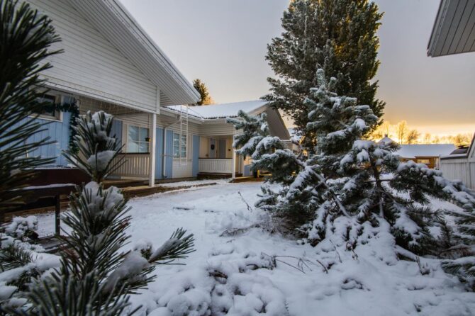 Апарт-отель состоит из нескольких двухэтажных домиков. Он построен на берегу реки Кеми в окрестностях Рованиеми. До ближайшего подъемника на Оунасваара – 1 км. В нескольких минутах ходьбы находятся рестораны, кафе и магазины. Во внутреннем дворе гостиничного комплекса размещены детская площадка, батут, атмосферная сауна в традиционном финском амбаре. Еще одну – переносную – ставят на берегу реки. На ресепшене можно заказать прогулку на оленьих/собачьих упряжках, снегоходах. Поле для гольфа расположено в 2-х км от отеля, а в 3-х километрах находится спортивный комплекс Сантаспорт.