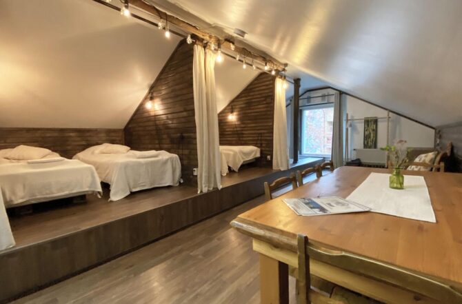 Пятиэтажная гостиница находится рядом с центральным стадионом Рованиеми. Окна с одной из ее сторон выходят прямо на спортивную арену. Вокруг много ресторанов, кафе и магазинов. Владельцы Туомас и Сату очень отзывчивые и гостеприимные люди. На кухне апартаментов всегда можно найти кофеварку, пакетики с кофе и некоторые необходимые для приготовления позднего ужина продукты (рис, макароны, соусы). Вернувшись вечером с горнолыжных спусков, можно отправиться в театр, который находится в 400 метрах от гостиницы, прогуляться по Lordi Square.