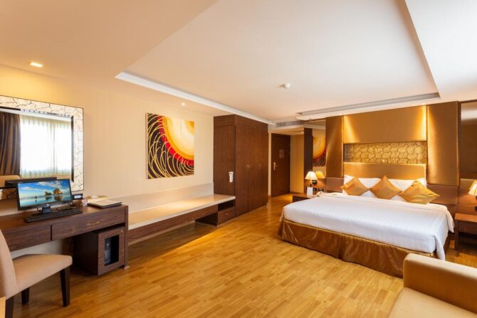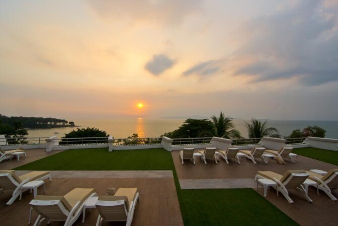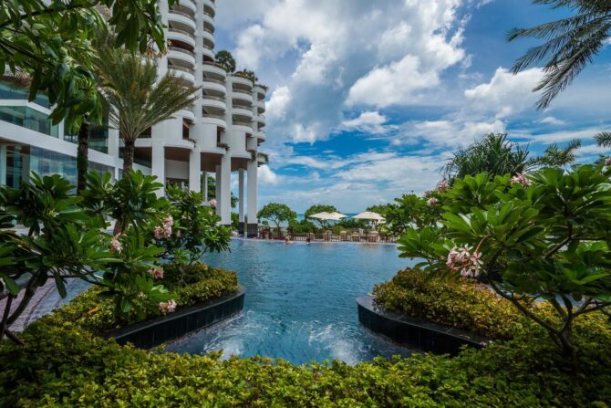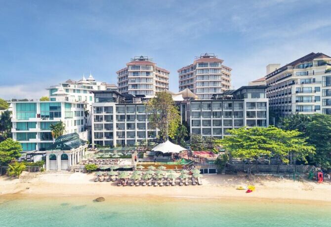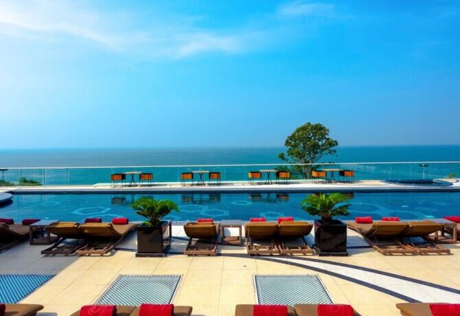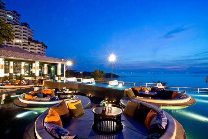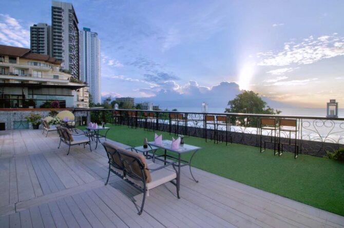 Второй из четырех отелей, входящих в группу Royal Cliff Hotels площадью 26 гектаров. Построенные на скалах здания граничат с частным песчаным пляжем с шезлонгами. Современные интерьеры имеют сильное тайское влияние, особенно в изысканном, высоком вестибюле. Его белые и оранжевые диваны, внутренние деревья и украшенная фонтаном статуя Будды кажутся карликовыми из-за стеклянных и металлических стен и продолговатых люстр. Каменный барельеф с русалками добавляет эклектичный оттенок. На открытых террасах, многие из которых выходят прямо на океан, можно отдохнуть под навесом на открытом воздухе. Гости здесь имеют доступ к обширным удобствам во всех четырех отелях Royal Cliff properties.
