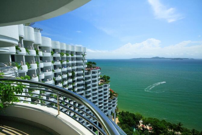 Гранд-Отель Royal Cliff является частью комплекса площадью 26 гектаров, состоящего из четырех отелей с общими удобствами. Современное 19-этажное здание с изогнутой белой архитектурой окружено тропической зеленью. Гости входят через вестибюль атриума, украшенный виньетками в землистых тонах, многоярусными люстрами, поразительной резьбой по дереву и тайскими фресками. Живописный пляж, но удаленный от достопримечательностей Паттайи.