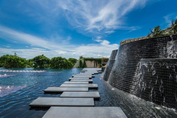 Наряду с частным песчаным пляжем здесь выделяется великолепный пейзажный бассейн. Его многоуровневые стенки свободной формы имеют фонтанные конструкции, подсветку, потрясающий вид на море и шезлонги с зонтиками. Гости также могут пользоваться другими бассейнами комплекса, а также 16 барами и ресторанами. В ресторане Larn Thong на территории отеля подают блюда тайской и интернациональной кухни по системе «шведский стол».