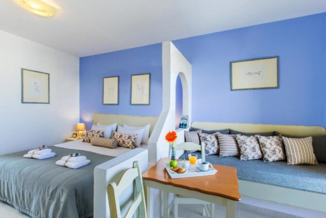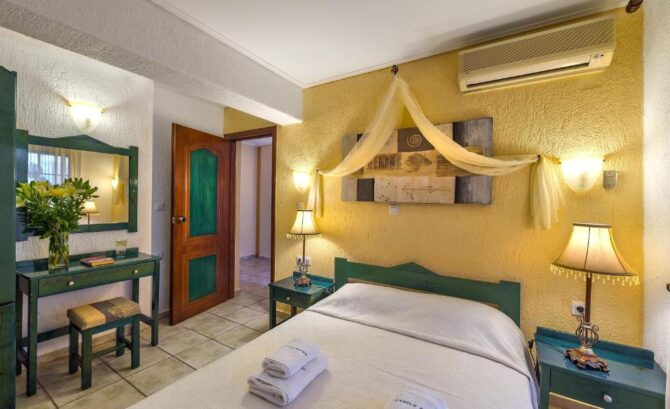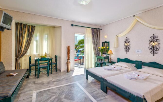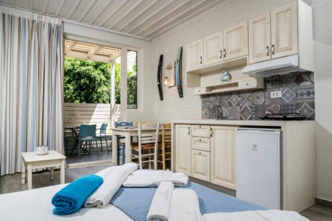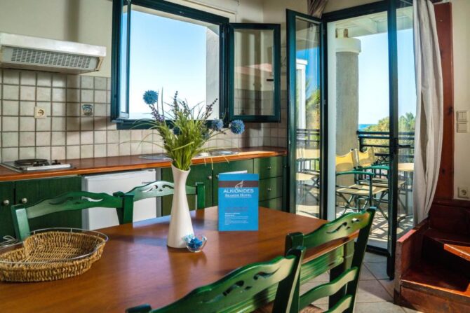 Апарт-отель «Алкионидес» имеет две звезды и располагается прямо на пляже – шум волн слышен в комнате. Это семейное предприятие с таверной и жилым корпусом, где можно снять квартиру с кухней и балконом. Из окон открывается вид на море или садик. Некоторые квартиры получили свежий эксклюзивный ремонт, другие выглядят попроще. Главный плюс – это цена. Семье с детьми или молодежной компании вскладчину гораздо выгоднее снимать квартиру, чем покупать туры с «всё включено». Во дворике отеля есть небольшой общий бассейн, немного шезлонгов и бар. Также в пешей доступности работает большое количество аутентичных таверн и ресторанов, а насчёт завтрака можно договориться с хозяевами или готовить самим.