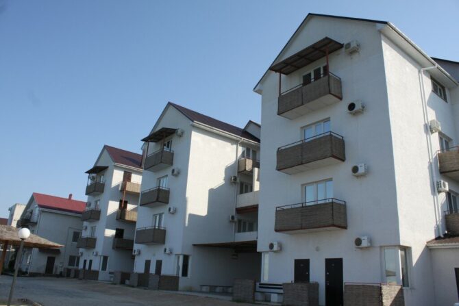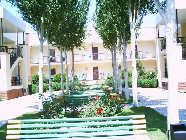 В номерном фонде пансионата для проживания семей с детьми предусмотрены одно-, двух- и трехкомнатные апартаменты с полностью оборудованными кухнями. Отель расположен на берегу Ойбурского озера. Жилые корпуса находятся в парке, состоящем из более чем 200 видов растений. Это создает особый микроклимат, максимально приближенный к атмосфере биосада. На территории отеля оборудован большой открытый бассейн с морской водой. По его периметру установлены шезлонги для принятия солнечных ванн. Для детей построена игровая площадка. Имеются зоны для барбекю (принадлежности выдаются бесплатно). Питание организуется самостоятельно. Как и все отели такого уровня, МНБ предоставляет услуги трансфера от/до вокзалов Евпатории и Симферополя.