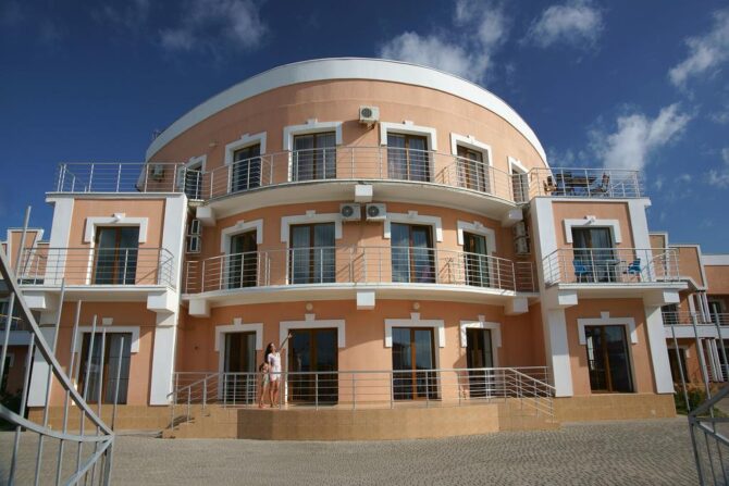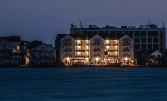 4-этажный отель расположен на первой береговой линии. В фонде 54 номера категорий Стандарт, Полулюкс, Люкс и особый люкс «Кристи». Дети до 5 лет проживают бесплатно, ребенку до 12 лет предоставляются скидки. Питание организуется по трем пакетам: завтрак, полупансион и 3-х разовое. Обслуживание производится по системе шведской линии. Разработано детское меню. Вход на пляж находится в 20 метрах. К нему ведут деревянные настилы. На берегу для гостей установлены навесы, шезлонги, работает бар. Второй пляж находится на озере Донузлав. Днем маленьких гостей развлекают аниматоры, по вечерам устраиваются показы мультфильмов. В корпусе оборудована игровая комната. При заказе трансфера в автомобили устанавливаются детские кресла.