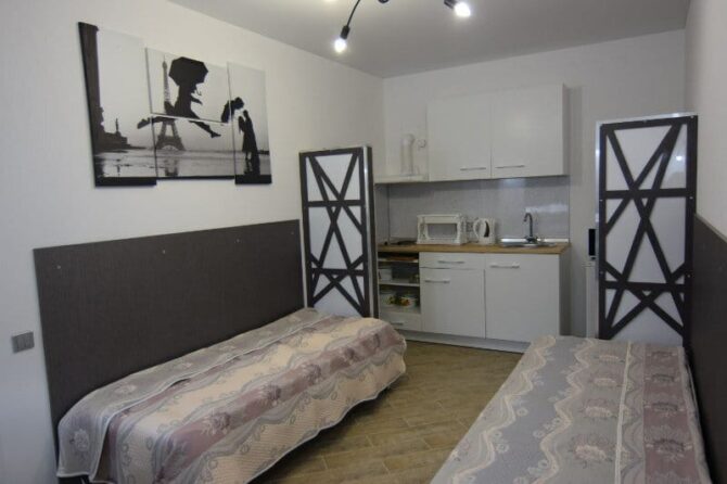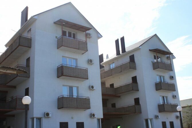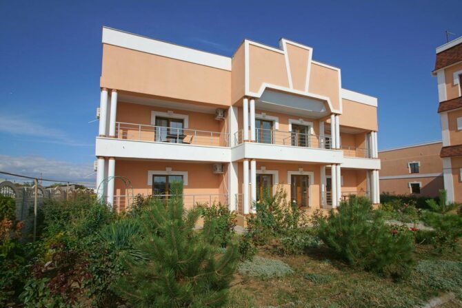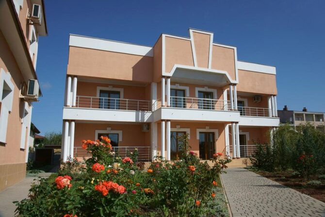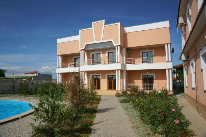 Семейный отель «Паллада» находится в 200 метрах от моря и пляжа. Все номера имеют балконы, а на первом этаже находится общая кухня. В здании всего 2 этажа и по своей архитектуре оно больше напоминает придорожный мотель. Во дворе имеется небольшая детская площадка. Для вечернего отдыха предназначена общая терраса и мангальная зона (бесплатно). В высокий сезон приглашаются аниматоры и проводятся детские праздники. На общей кухне предусмотрена посуда по количеству максимальной загруженности отеля. Для проживания подготовлено 15 номеров вместимостью от 2 до 4 человек. До пляжа 5 минут ходьбы, напротив отеля находится продуктовый рынок, магазины.