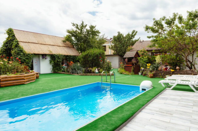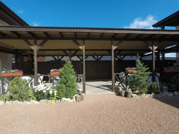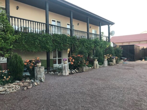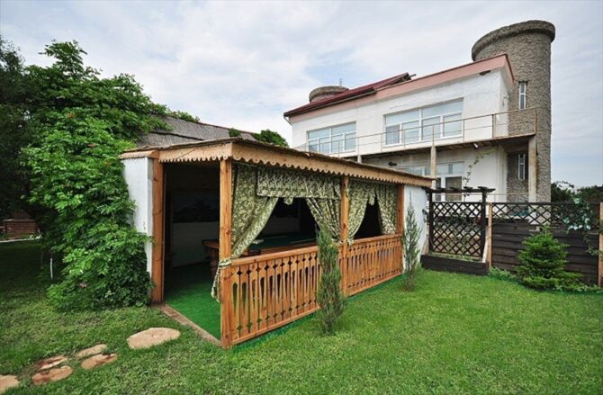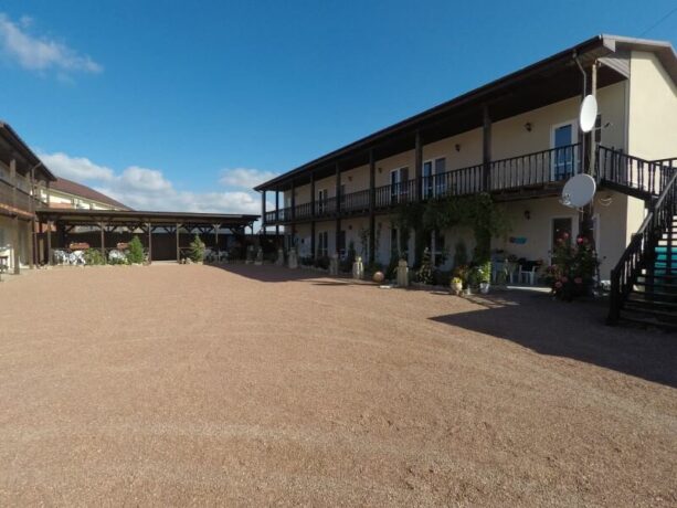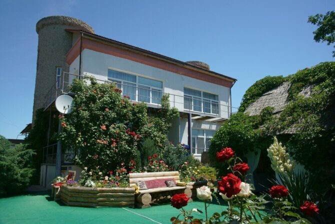 Усадьба построена в стиле украинского подворья. В отделке и декоре много дерева, домашнего текстиля, утвари из крестьянского быта. На [y] год действуют возрастные ограничения – отель сможет принимать детей только с 5-летнего возраста. Также гости не смогут готовить еду самостоятельно. Столовая предлагает комплексное меню, которое меняется каждые 10 дней. Гостевой дом принимает постояльцев, приезжающих на курорт более, чем на 5 дней. Здесь предусмотрены все условия для длительного проживания. В стоимость включены парковка, бассейн, детская площадка, мангальная зона, гладильная комната. До Центрального пляжа идти 5 минут.