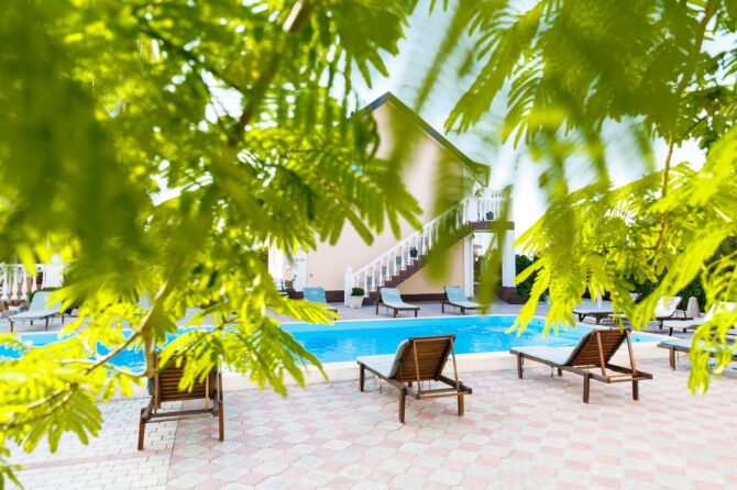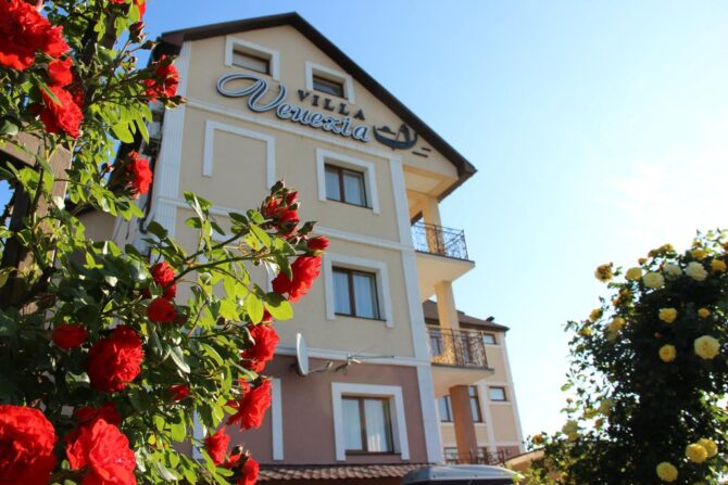 Если хочется поселиться в тихом месте, а ребенок мечтает об аквапарке, то стоит рассмотреть в качестве проживания мини-гостиницу «Вилла Венеция». Она находится далеко от центра города, зато близко к аквапарку «Зурбаган» (500 м). Благоустроенные пляжи бухты Омега расположены в шаговой доступности. Они протянулись по побережью на 1 км. Здесь есть мелководный «лягушатник», на котором обустроен детский пляж.