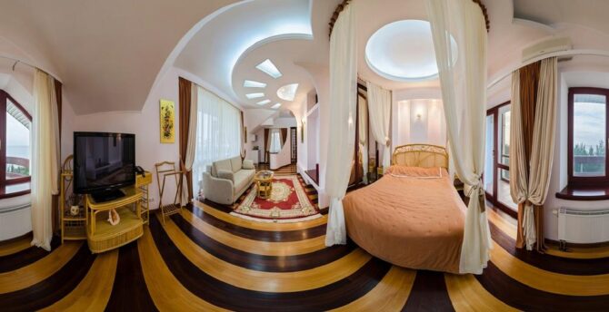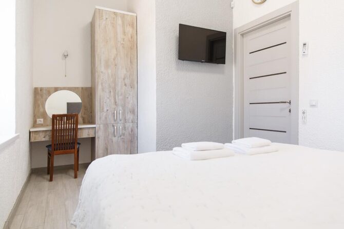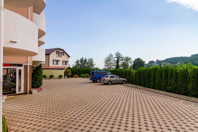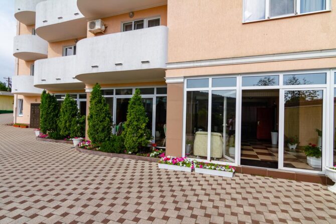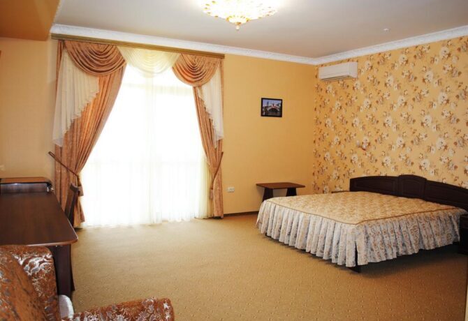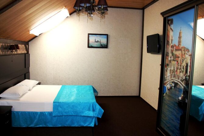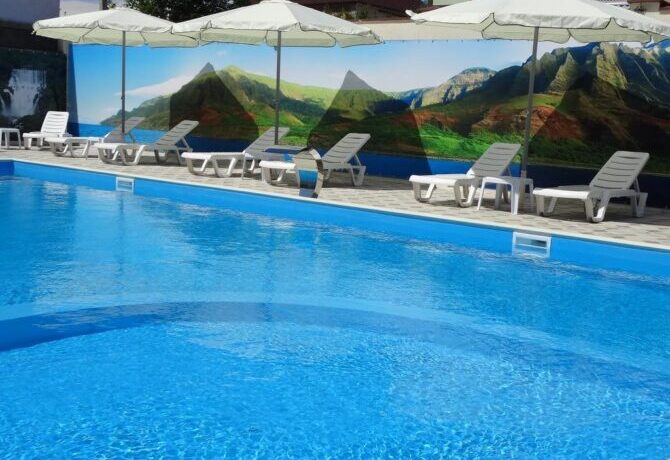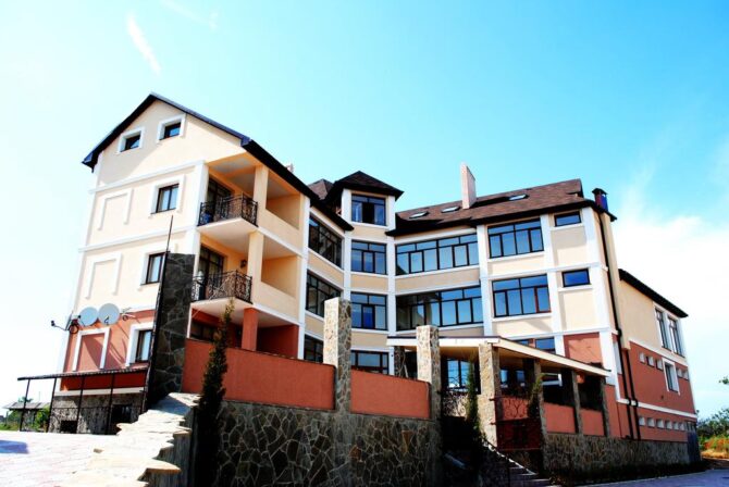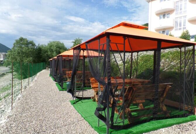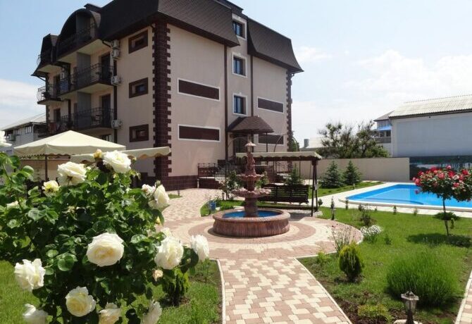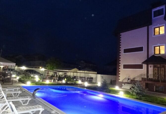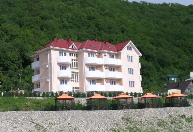 Небольшой гостиничный комплекс состоит из 4-этажного здания на 12 номеров, отдельно стоящего двухэтажного коттеджа, кафе, открытого подогреваемого бассейна на крыше, бани с купелью. Для семейного размещения предлагаются апартаменты с оборудованной кухней. Проживание без питания. В кафе можно заказать завтрак, обед и ужин по меню или включить завтрак в стоимость номера.