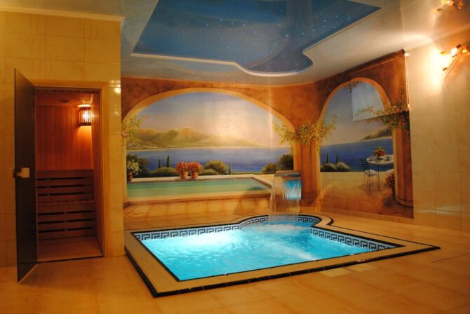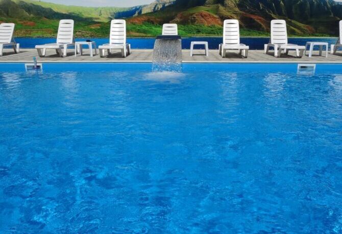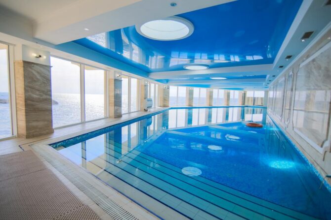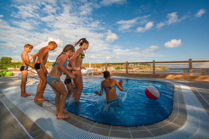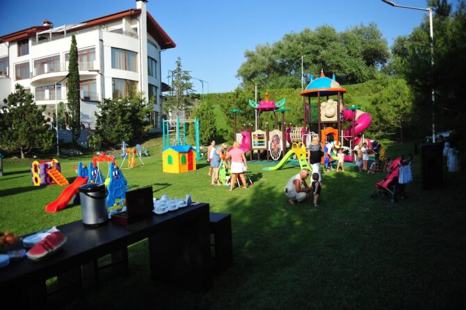 Имеются крытый и открытый бассейны с отдельной детской мелководной чашей. Пляж находится в 50 метрах. Покрытие песочно-галечное. Территория не огорожена, но охраняемая. Для детей установлены батуты, построена игровая площадка на улице, оборудована детская комната в помещении. Предоставляются услуги воспитателя.