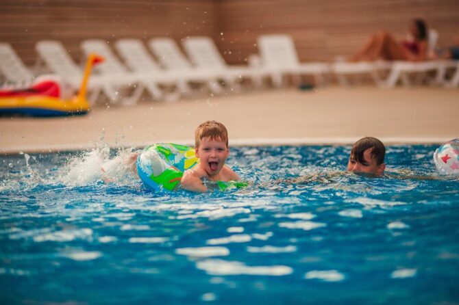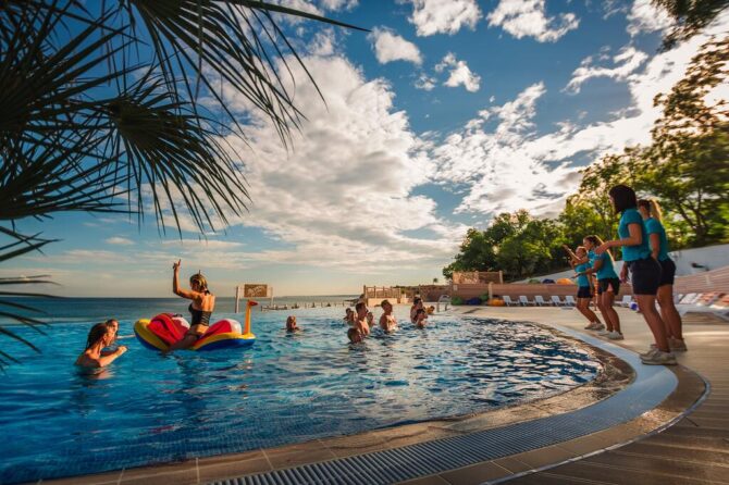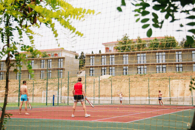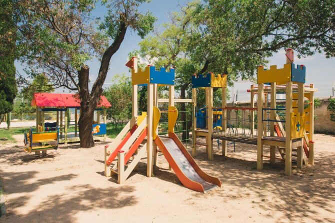 Дети до 3-х лет принимаются бесплатно с предоставлением питания. Для них построена игровая площадка на улице, детское отделение в бассейне, установлены батуты на пляже. Песчаный пляж благоустроен. На нем установлены зонтики, душевые кабинки, раздевалки, туалеты, работает прокат шезлонгов и спортивного снаряжения.