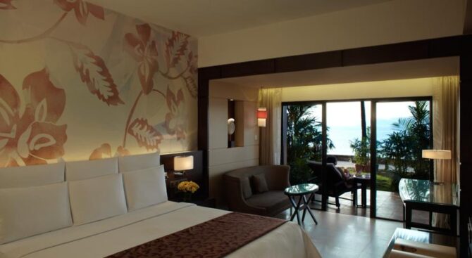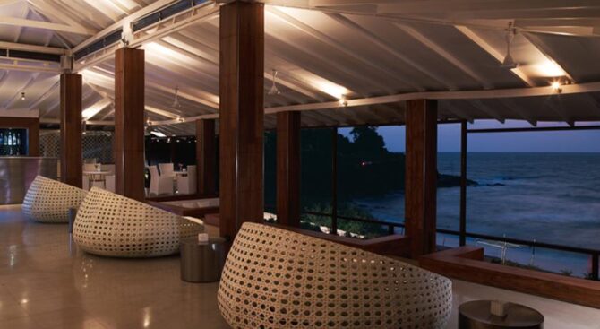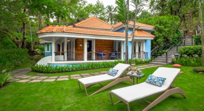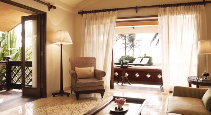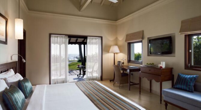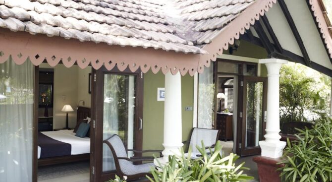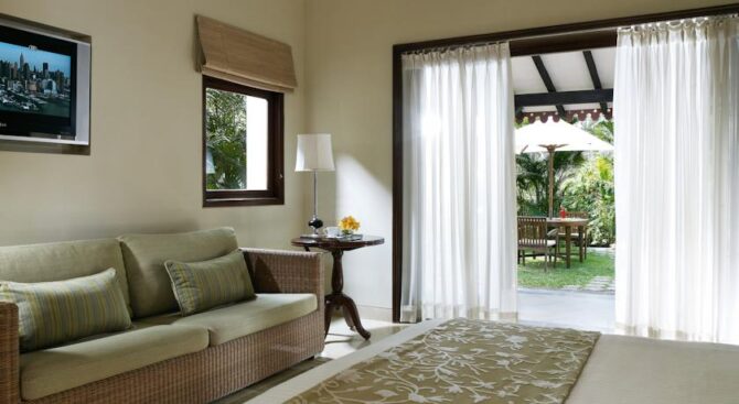 Если вы ищите отель, который максимально близко расположен к морю, тогда вам в Vivanta by Taj Holiday Village. Отель находится всего в двух минутах прогулочной ходьбы от пляжа. Его номера — это коттеджи с яркой крышей, находящиеся в живописном саду. Площадь отеля составляет одиннадцать с половиной гектаров.