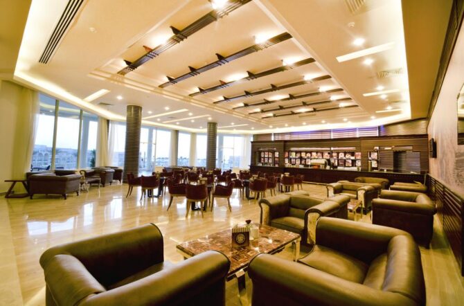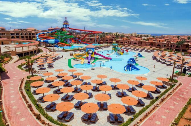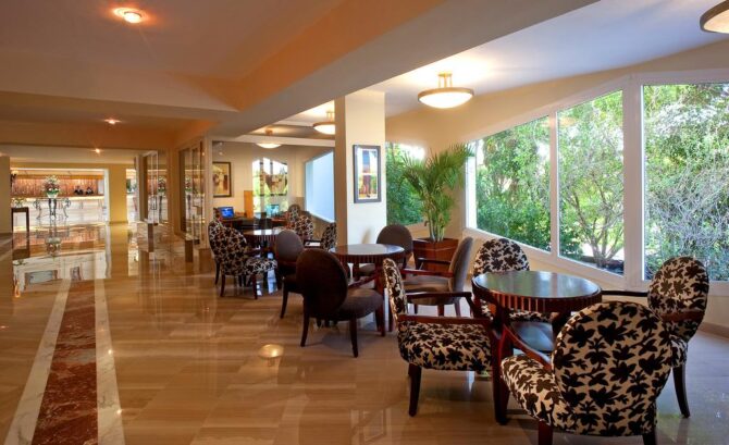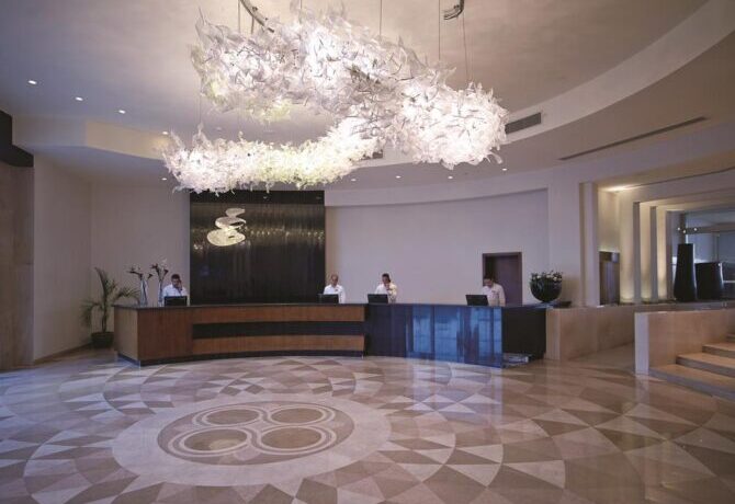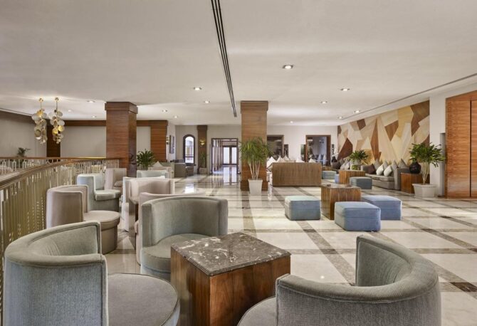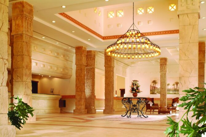 В отеле есть пандусы, лифт находится в огромном вестибюле, украшенном огромными каменными колоннами, кожаными диванами и богато украшенной люстрой. Здесь шесть бассейнов, а также аквапарк с детскими и взрослыми горками.