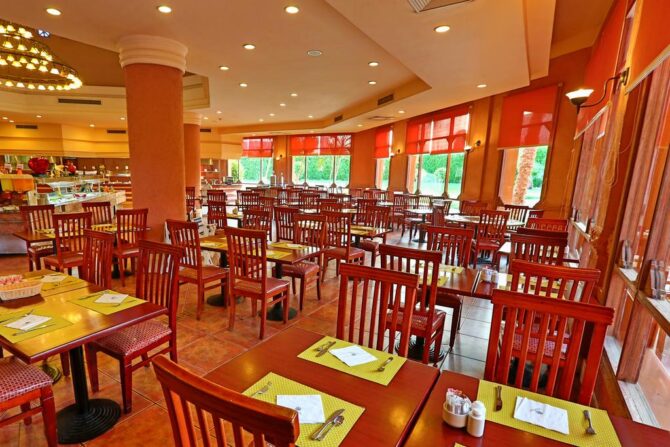 В стоимость проживания по системе «Все включено» входит завтрак, обед и ужин в виде шведского стола, а также один сеанс питания в неделю в ресторане с обслуживанием по меню. Неограниченный местные алкогольные напитки, широкий ассортимент безалкогольных коктейлей и соков также входят в стоимость и подаются в ресторане во время обеда.