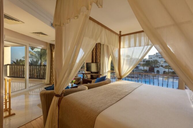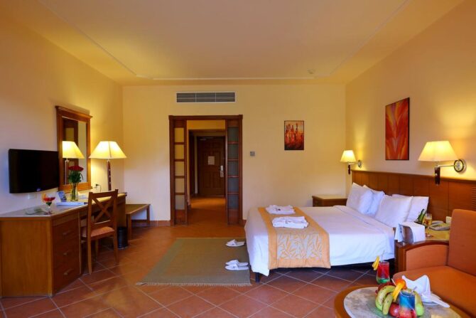 Номера оформлены в элегантном современном стиле, а виллы обставлены традиционно, с арабским декором и древнеегипетской тематикой. К услугам гостей свежие цветы, фрукты, бесплатный высокоскоростной Wi-Fi, хорошо укомплектованный мини-бар и другие удобства. Ванные комнаты отделаны мрамором, укомплектованы полотенцами, халатами и тапочками, качественными туалетными принадлежностями и настенным феном.