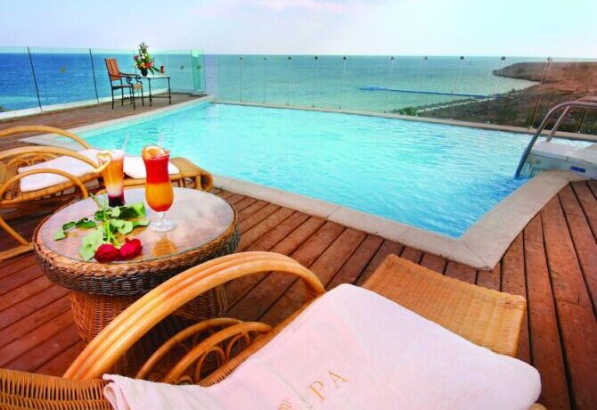 В отеле есть один главный бассейн олимпийского размера, окруженный множеством шезлонгов и подогреваемый в прохладные месяцы. Здесь также есть частично крытый бассейн с видом на море только для взрослых, а также отдельный бассейн для детей.