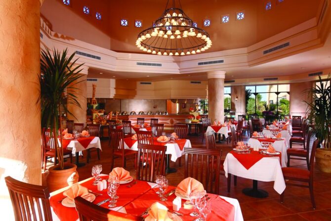 Курорт отличается хорошим выбором ресторанов, где подают все: от паназиатской и итальянской кухни, до мексиканской и индийской. Гостям предоставляется услуга «шведский стол» на завтрак, обед и ужин, а многочисленные бары подают напитки и закуски в течение всего дня.