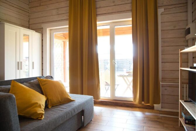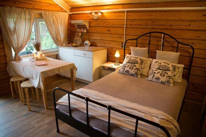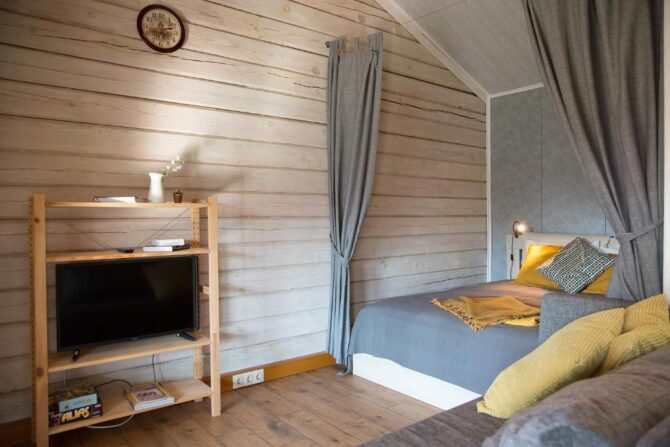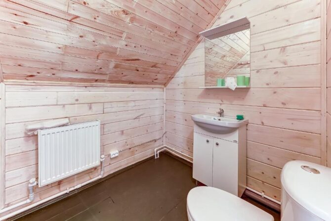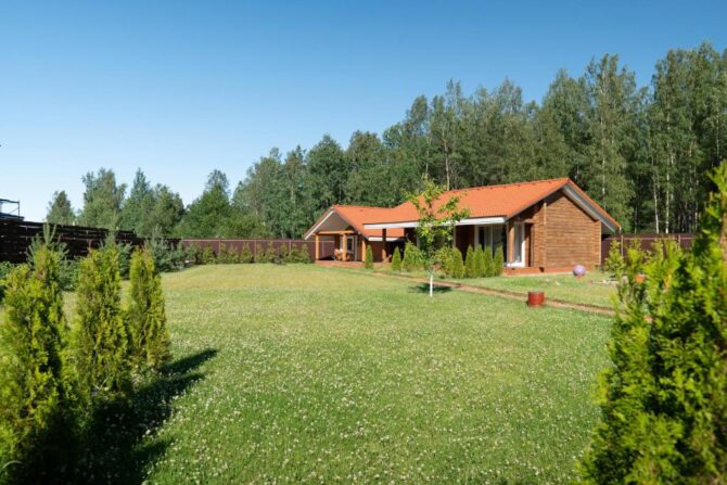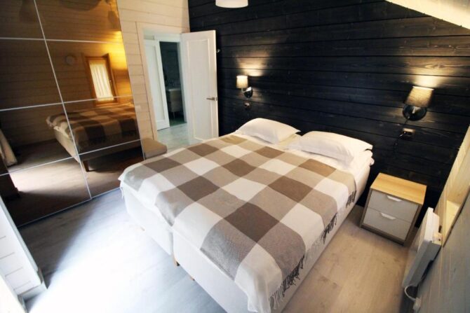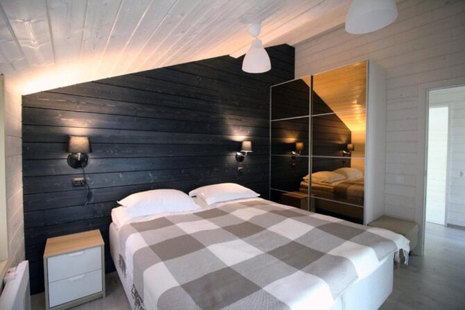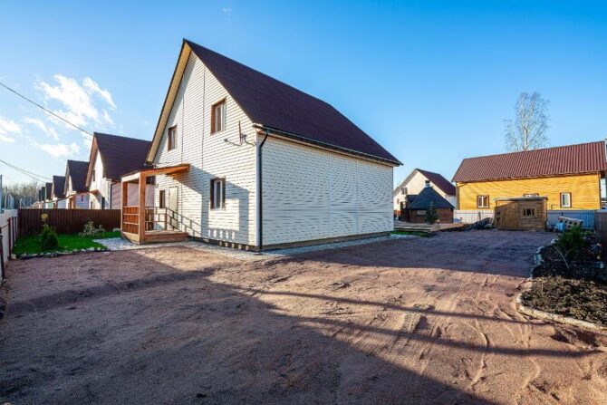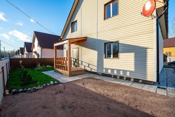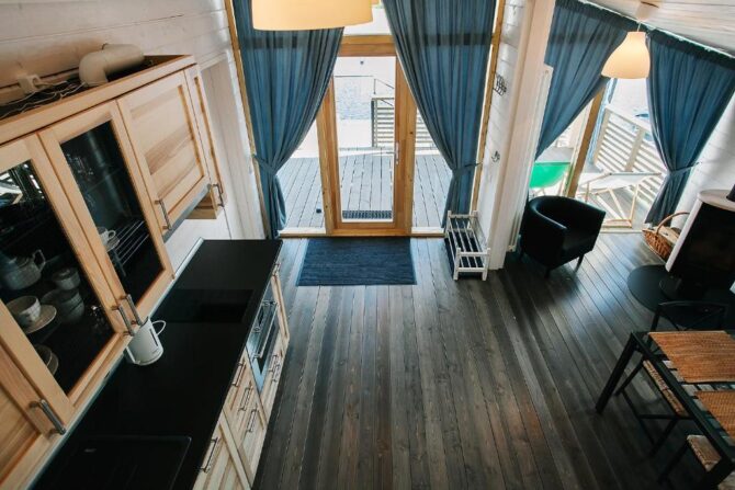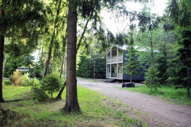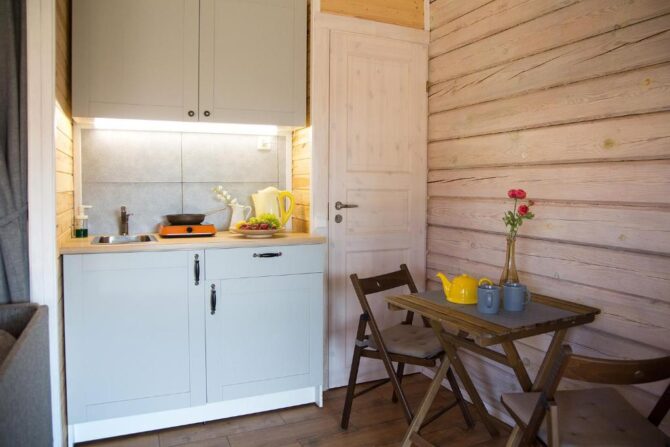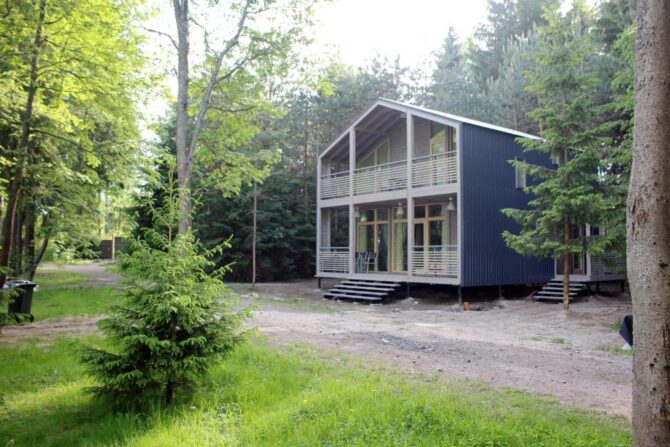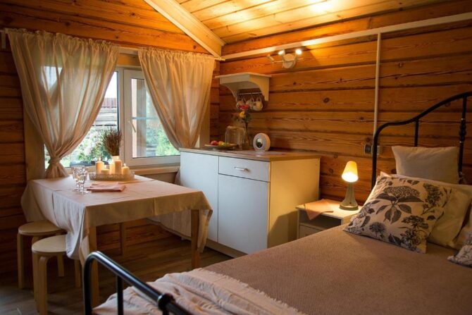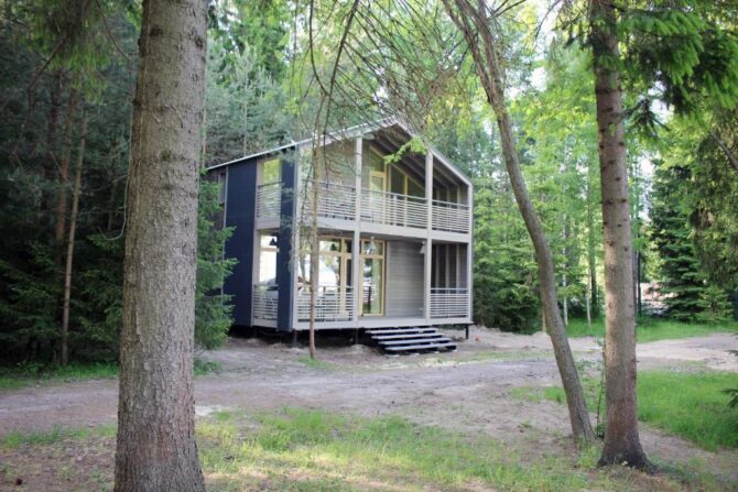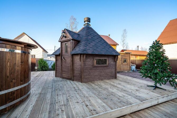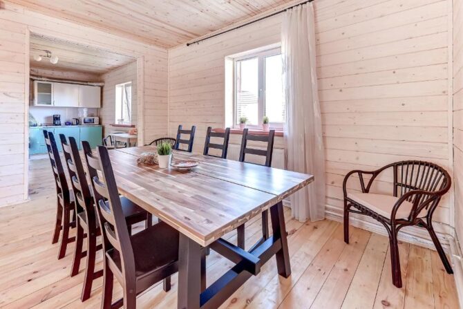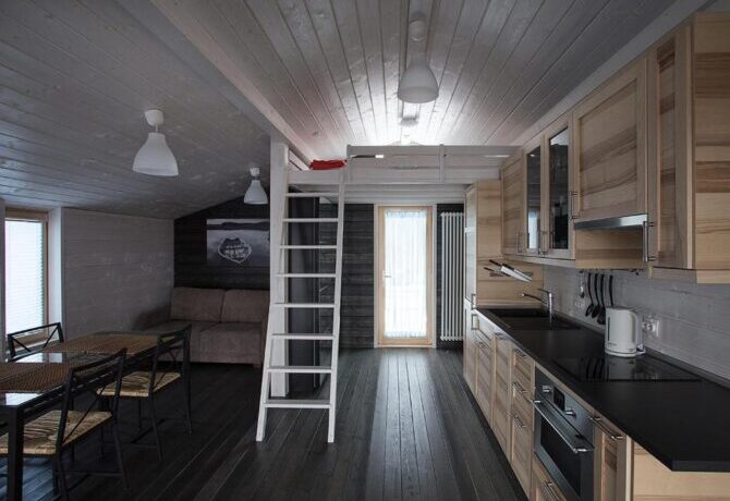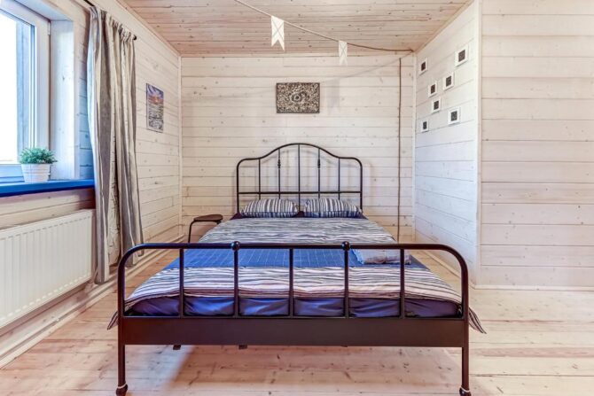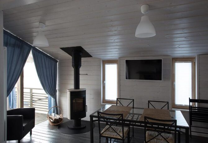 В том же поселке Морозова сдается еще один дом, сделанный в стиле хюгге. Он занимает участок № 152. Площадь дома – 30 кв. м., спальня расположена в нише и отделена от гостевой зоны плотными шторами. Кухня находится отдельно. На террасе установлена легкая мебель, в санузле – современная душевая кабина. Во дворе имеется небольшая детская игровая площадка, построена банька, стоит мангал. Пользование включено в оплату проживания. Проблем с организацией питания не возникнет. Рядом находятся торговый центр, продуктовый магазин и небольшое кафе.