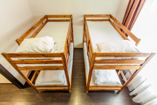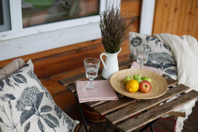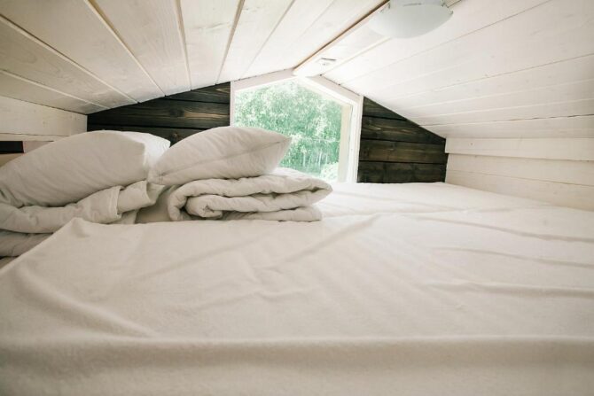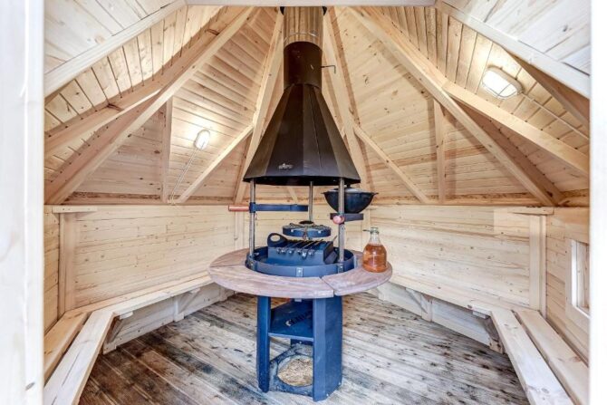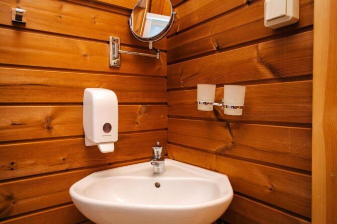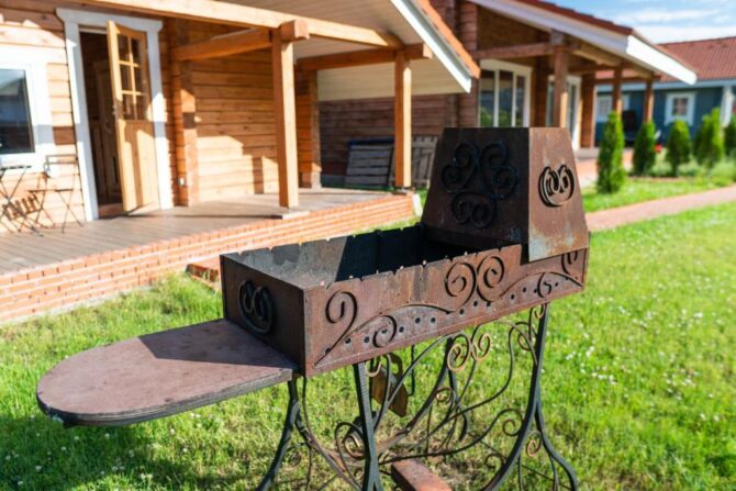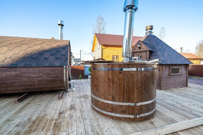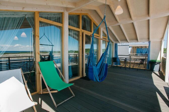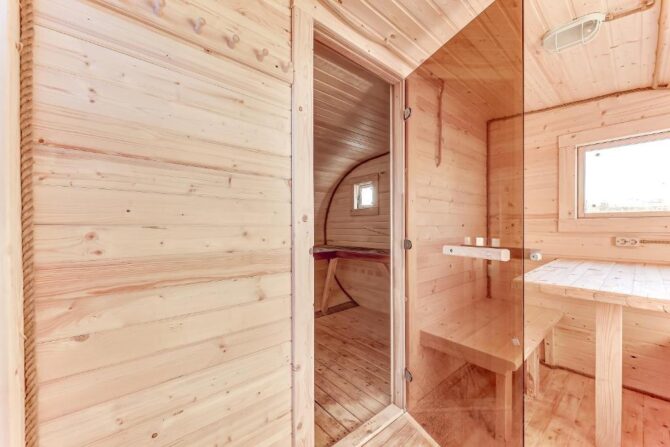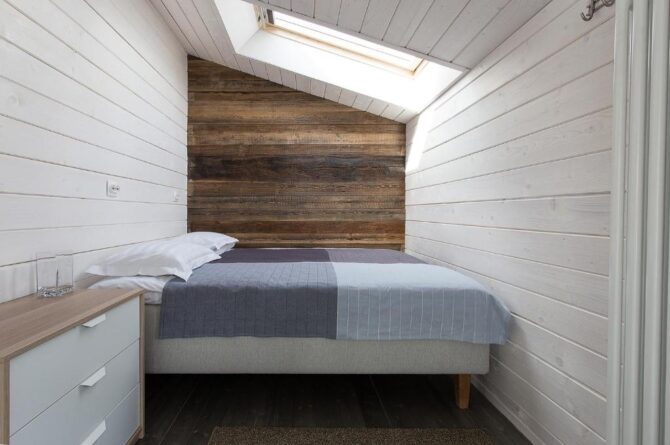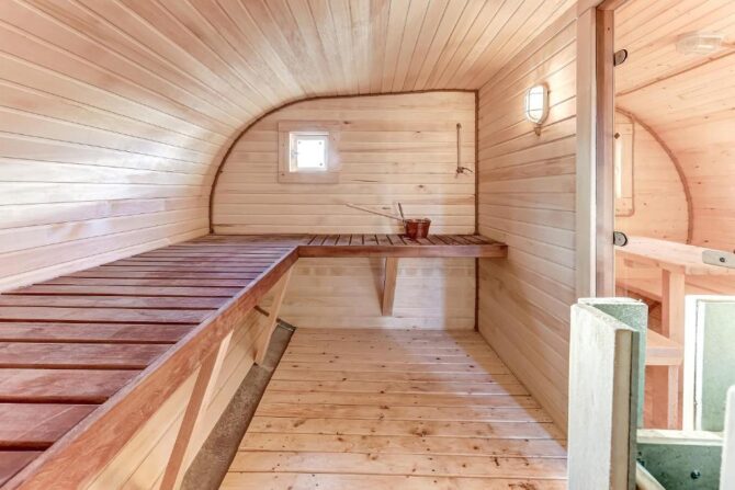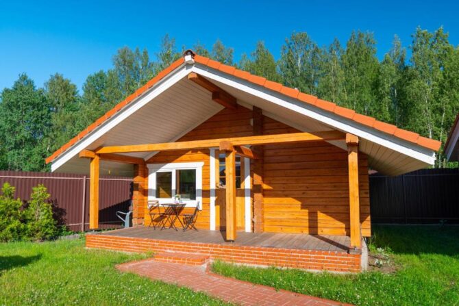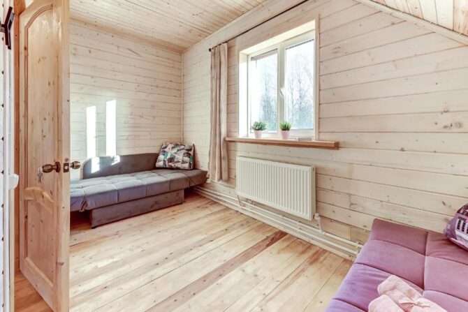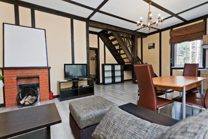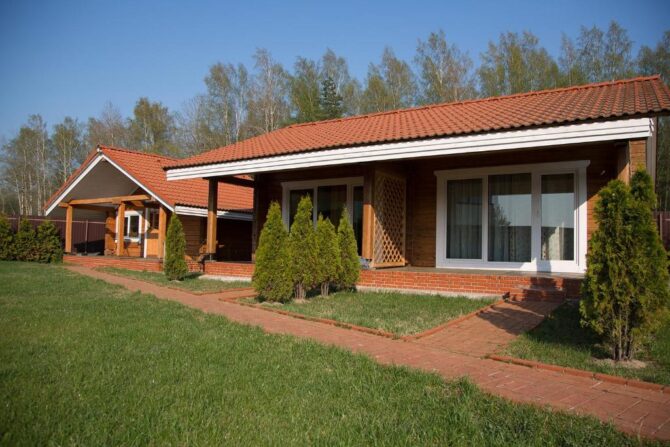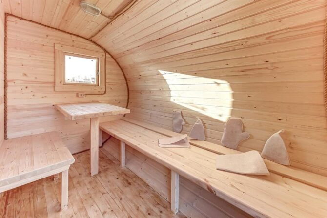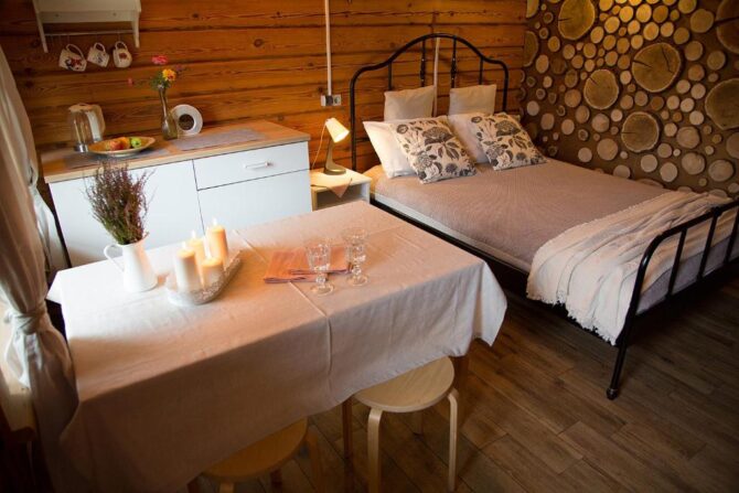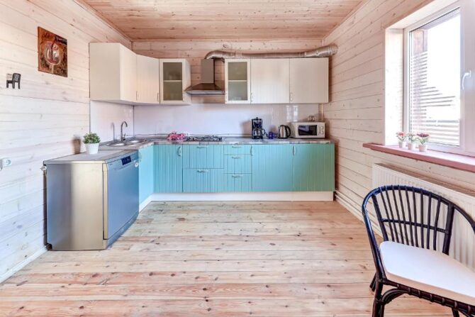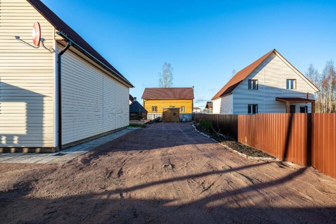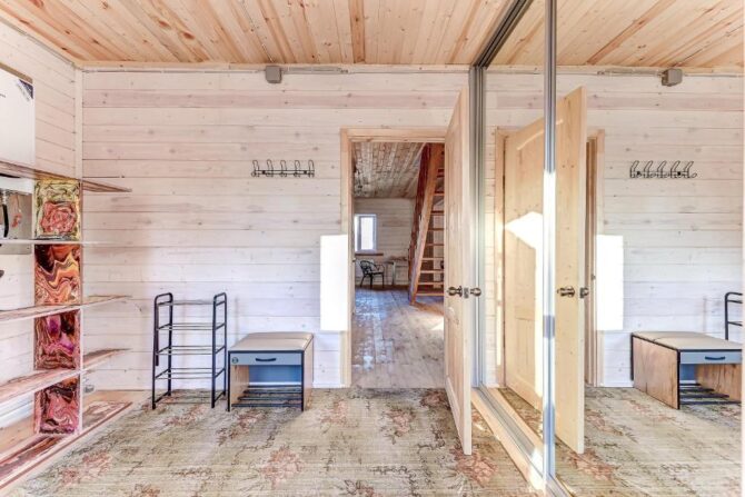 В том же поселке Морозова сдается еще один дом, сделанный в стиле хюгге. Он занимает участок № 152. Площадь дома – 30 кв. м., спальня расположена в нише и отделена от гостевой зоны плотными шторами. Кухня находится отдельно. На террасе установлена легкая мебель, в санузле – современная душевая кабина. Во дворе имеется небольшая детская игровая площадка, построена банька, стоит мангал. Пользование включено в оплату проживания. Проблем с организацией питания не возникнет. Рядом находятся торговый центр, продуктовый магазин и небольшое кафе.