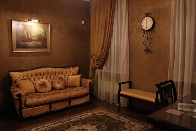 В 15-ти минутах ходьбы от набережной находится еще один исторический дизайн-проект – гостиница «Петровская». В ней всего 11 номеров. Все оформлены в индивидуальных стилях. Среди них есть Стандарты (двух, трех местные, улучшенные категории «Комфорт»), Делюксы и номера эконом класса с общими удобствами. Своего ресторана нет. Утром подается континентальный завтрак. Гости пользуются услугами ресторанов города или готовят еду самостоятельно на общей кухне. В ней установлены большой холодильник, электроплита, чайник, обеденный стол, имеется вся посуда. На территории бесплатно предоставляется открытая парковка. Через дорогу недавно открылся крытый паркинг, стоянка платная.