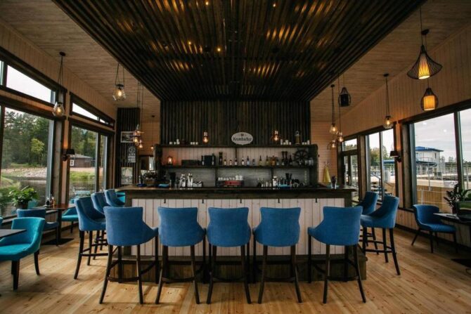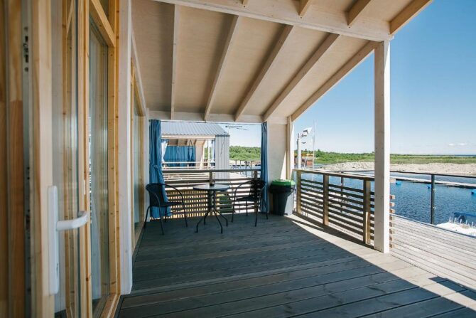 База отдыха имеет статус яхт-клуба. На территории фарватера обустроена марина для катеров, яхт и других малых судов. Для проживания гостей построены: мотель (в нем любят останавливаться романтично настроенные пары), двухэтажный коттедж для веселой компании, семейные бунгало с видом на озеро. Питание организует плавучий ресторан «Porto Bar». В меню много блюд, приготовленных из свежевыловленной рыбы и морских деликатесов. Еда не входит в стоимость проживания, так как все дома оборудованы современными кухнями. Кроме водных прогулок здесь занимаются верховой ездой, пляжным отдыхом, рыбалкой, пешими походами, лыжным спортом. После активного и насыщенного событиями дня гости предпочитают расслабляться в бане или сауне. Недавно поблизости запустили новый «Веревочный парк», в котором предусмотрены трассы разной сложности. Сюда приезжают на автомобилях или катерах. Парковка и причал входят в стоимость проживания.