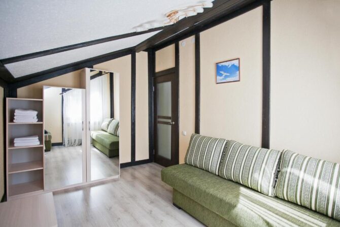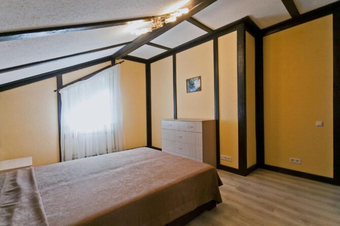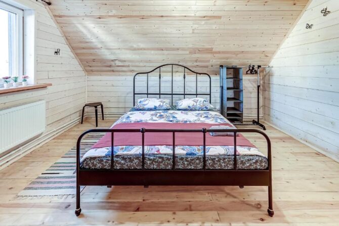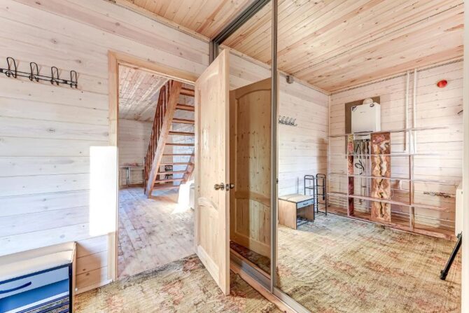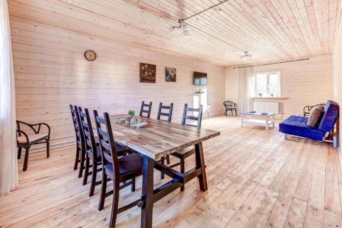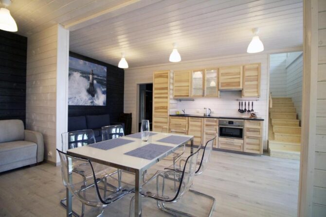 Двухэтажный ЭКО-коттедж находится в частном секторе Шлиссельбурга. Внутренняя отделка полностью выполнена из дерева, кухня оборудована электроплитой, холодильником, посудомоечной машиной, бытовой техникой. На первом этаже расположена гостиная, столовая, на втором – просторные спальни с кованными кроватями и диванами в качестве дополнительных спальных мест. На окнах предусмотрены жалюзи и льняные шторы. Главное достоинство заключается в наличии собственной бани-сауны и уличной купели с подогревом воды. Рядом построен гриль-домик, который используется в качестве зоны отдыха после парных процедур. Гости высоко оценивают соотношение цены и качества, традиции гостеприимства и интернет-скорости.
