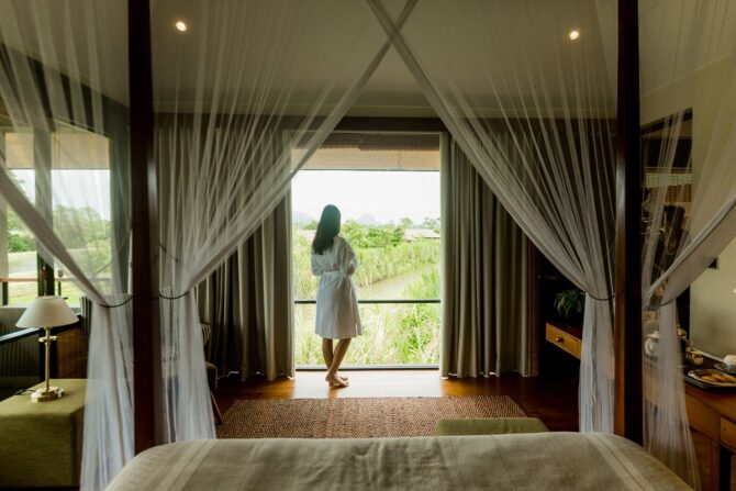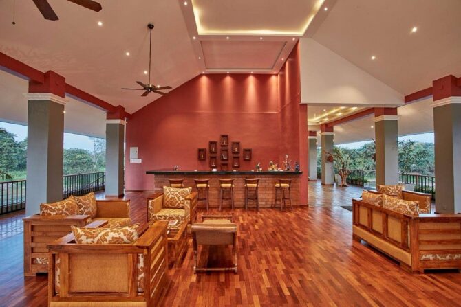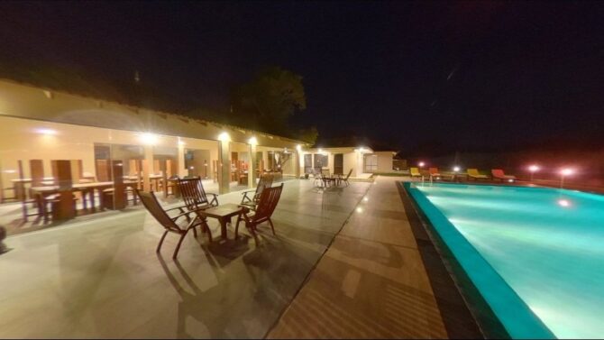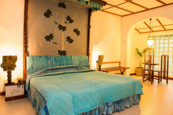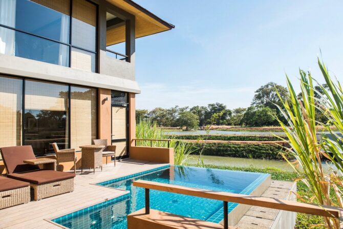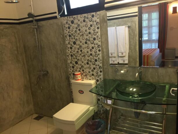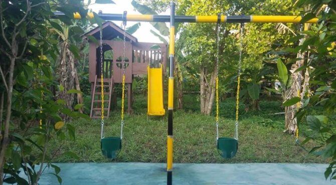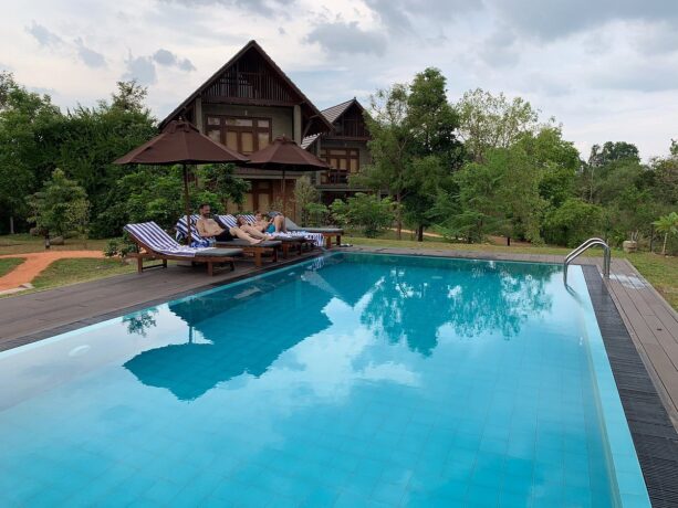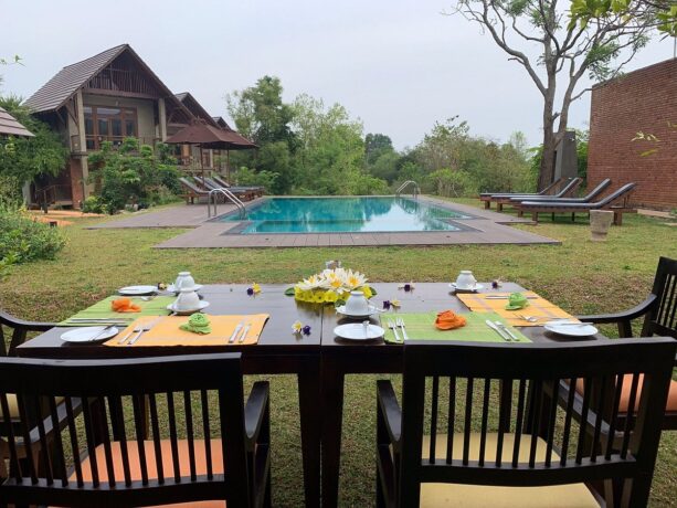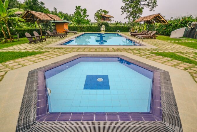 Гости могут расслабиться на лужайке в зоне отдыха. Здесь же расположено два небольших бассейна: в форме шестиугольника – для детей, и прямоугольный – для взрослых туристов. Юные гости и их родители веселятся на качелях, установленных на лужайке среди высоких деревьев. Азиатские и европейские блюда сервируются в ресторане отеля, работающем по системе bed & breakfast, что в русском языке обозначается как «проживание (кровать) и завтрак».