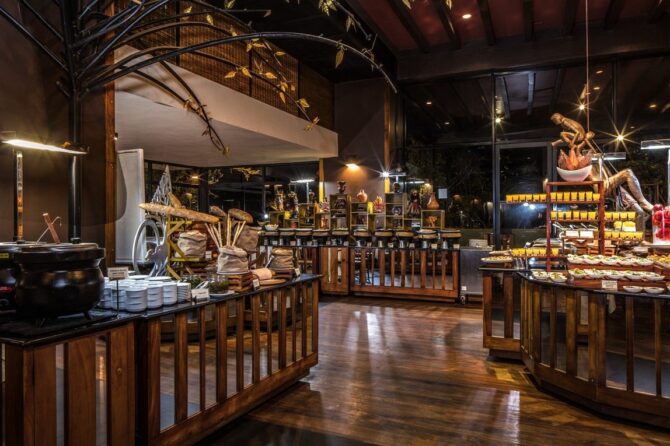 По желанию отдыхающих завтраки могут сервироваться в номерах. Для гостей отеля работает уютный лобби-бар. Меню ресторана, представляющего собой просторный павильон с деревянной крышей и большой террасой, включает широкий ассортимент азиатских, местных и европейских блюд.