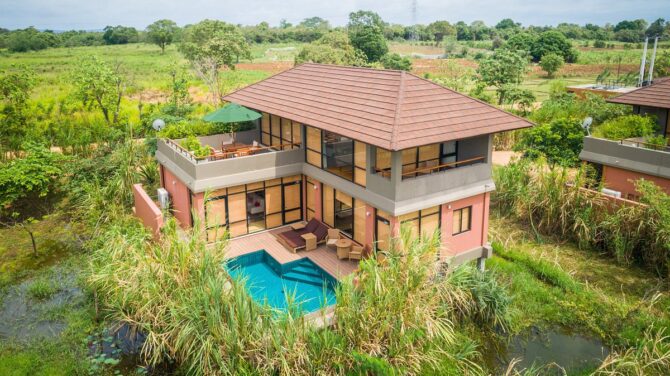 Туристы, мечтающие несколько дней пожить в уединенном месте среди рисовых полей и джунглей, непременно оценят преимущества пятизвездочного гостиничного комплекса, «владения» которого расположены в 6,5 км к юго-западу от Львиной скалы. Отель с необычным названием Jetwing Vil Uyana предлагает выбор из 36 бунгало пяти категорий: