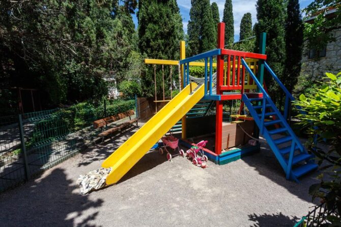 Дети до 3-х лет могут проживать бесплатно. Для них предоставляются кроватки, стульчики. Во дворе обустроена детская площадка.
